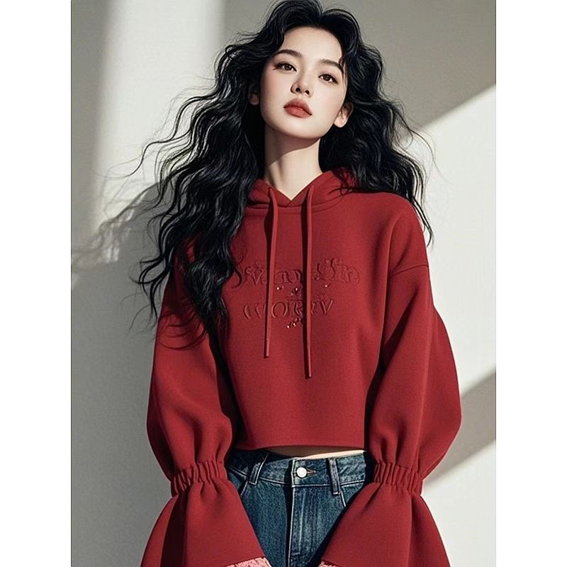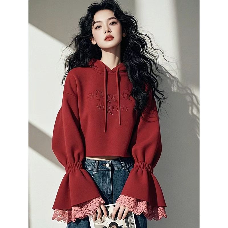 FA44693# 秋季新款爆款时尚洋气小个子韩系慵懒风红色蕾丝拼接连帽卫衣 服裝批發女裝批發服飾貨源