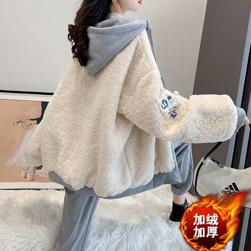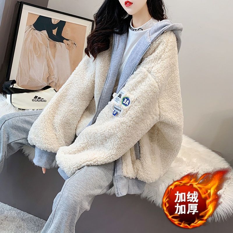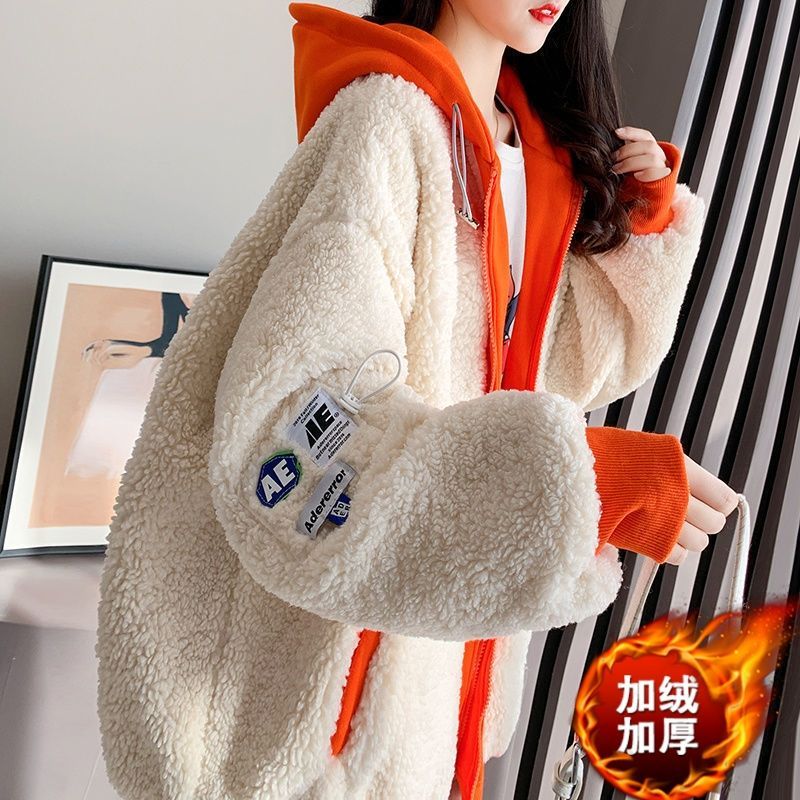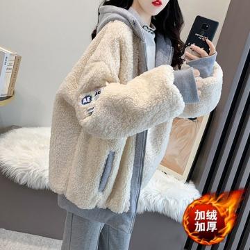 FA44775# 米粒绒复合真超秋冬加绒加厚拼色连帽卫衣外套 服裝批發女裝批發服飾貨源