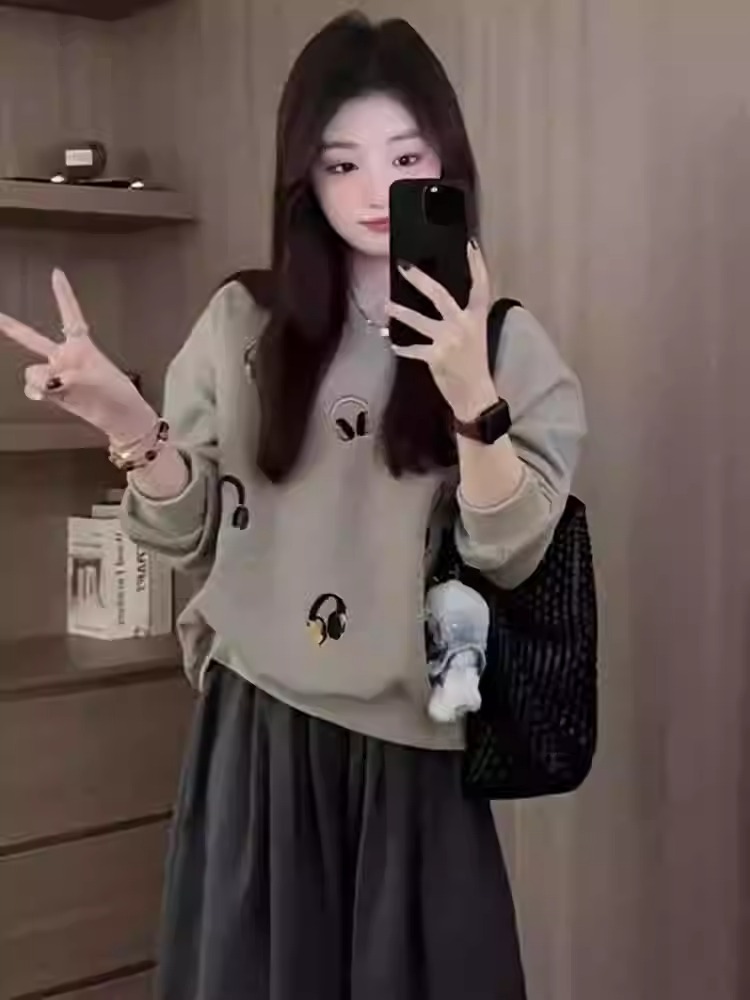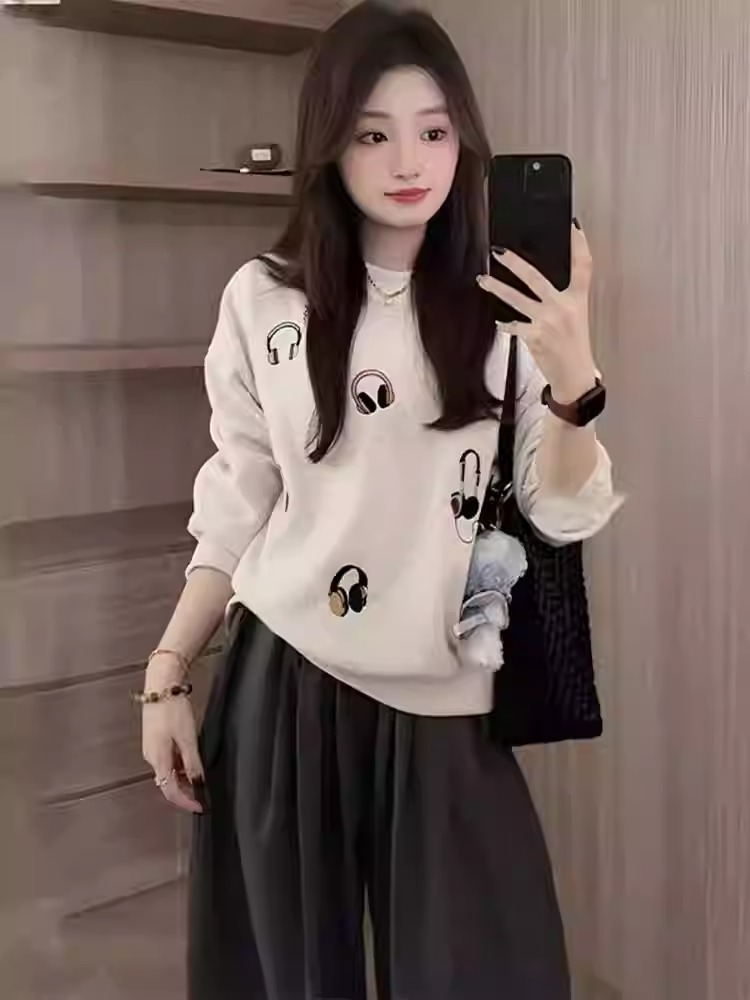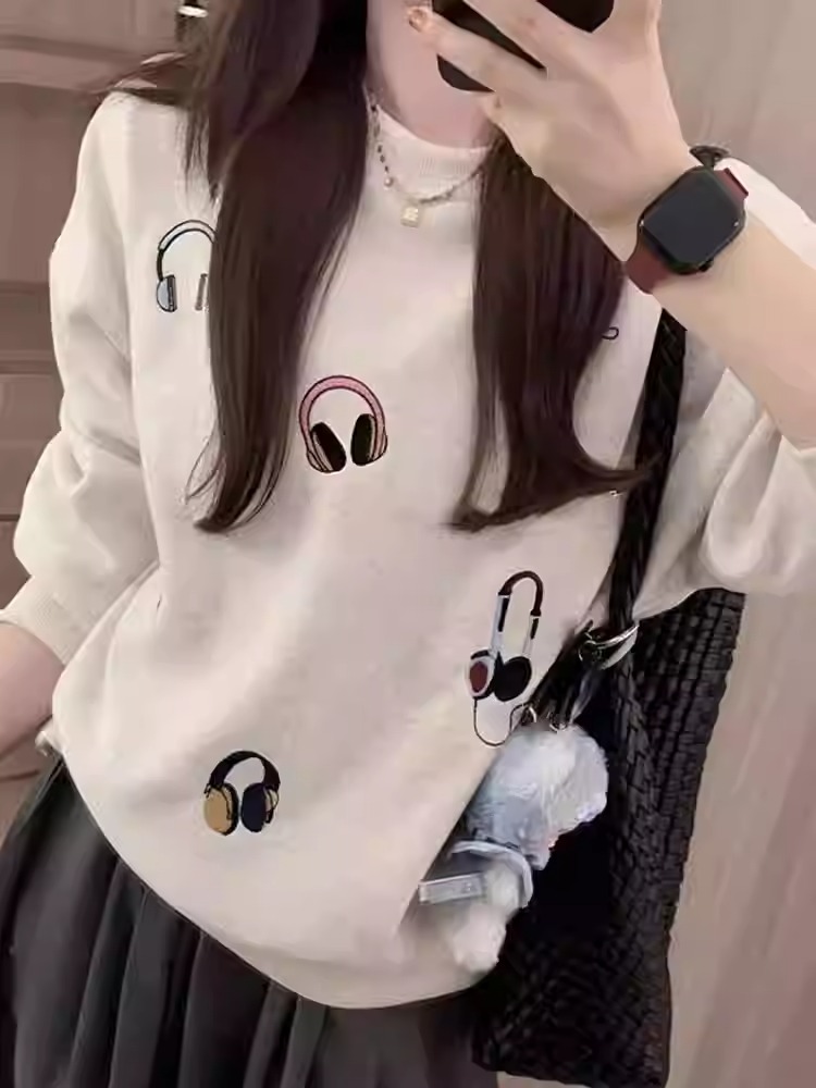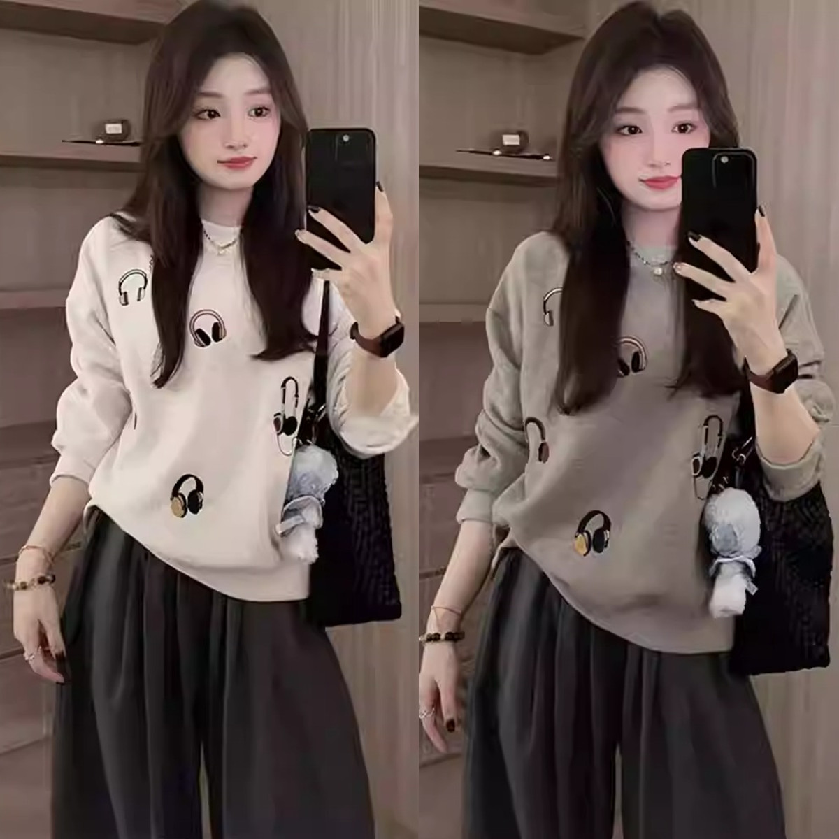 FA44816# 韩国外贸新款华棉刷毛卫衣女刺绣戴耳机韩系ins风刺绣款 服裝批發女裝批發服飾貨源
