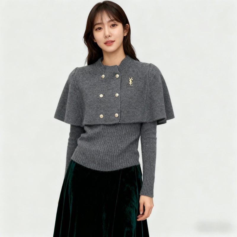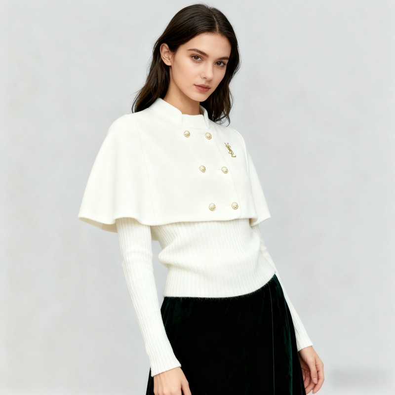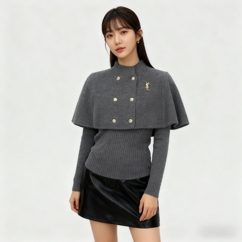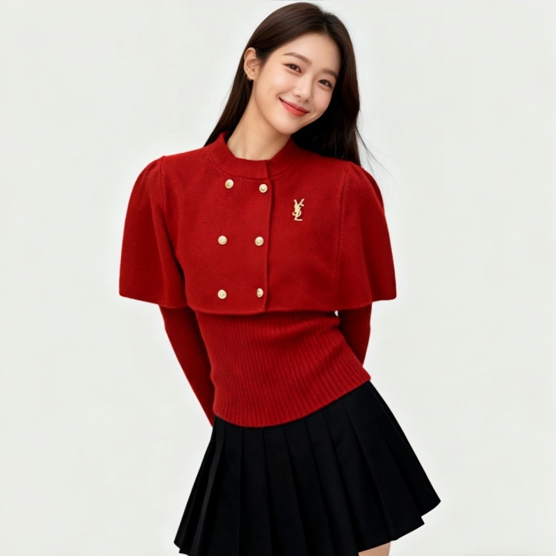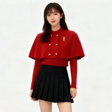 FA45311# 法式赫本风复古双排扣立领斗篷毛衣两件套秋冬女装红色保暖针织衫 服裝批發女裝批發服飾貨源