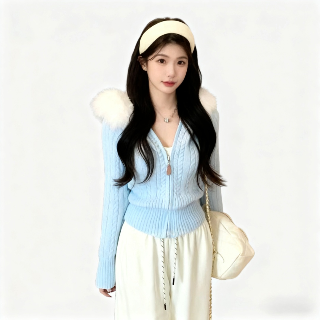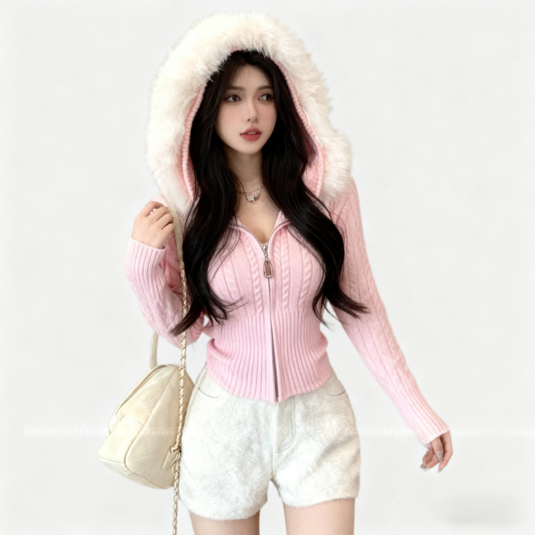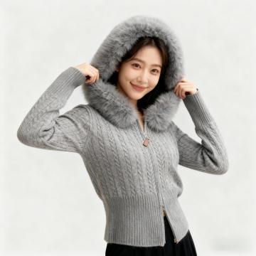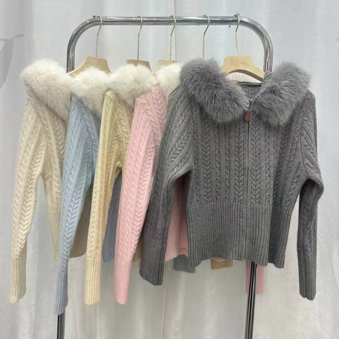FA45312# 秋冬韩系新款温柔系气质毛领拉链麻花毛衣连帽针织长袖开衫女 服裝批發女裝批發服飾貨源