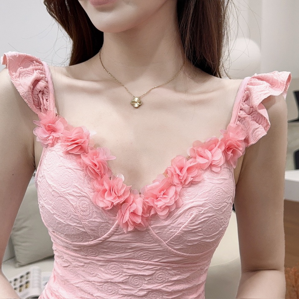 FA46693# 新款法式甜美吊带连衣裙女收腰显瘦立体花装饰气质短裙 服裝批發女裝批發服飾貨源