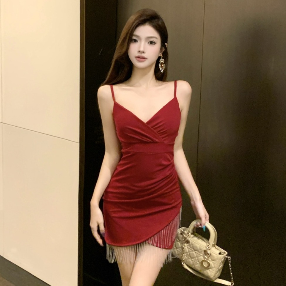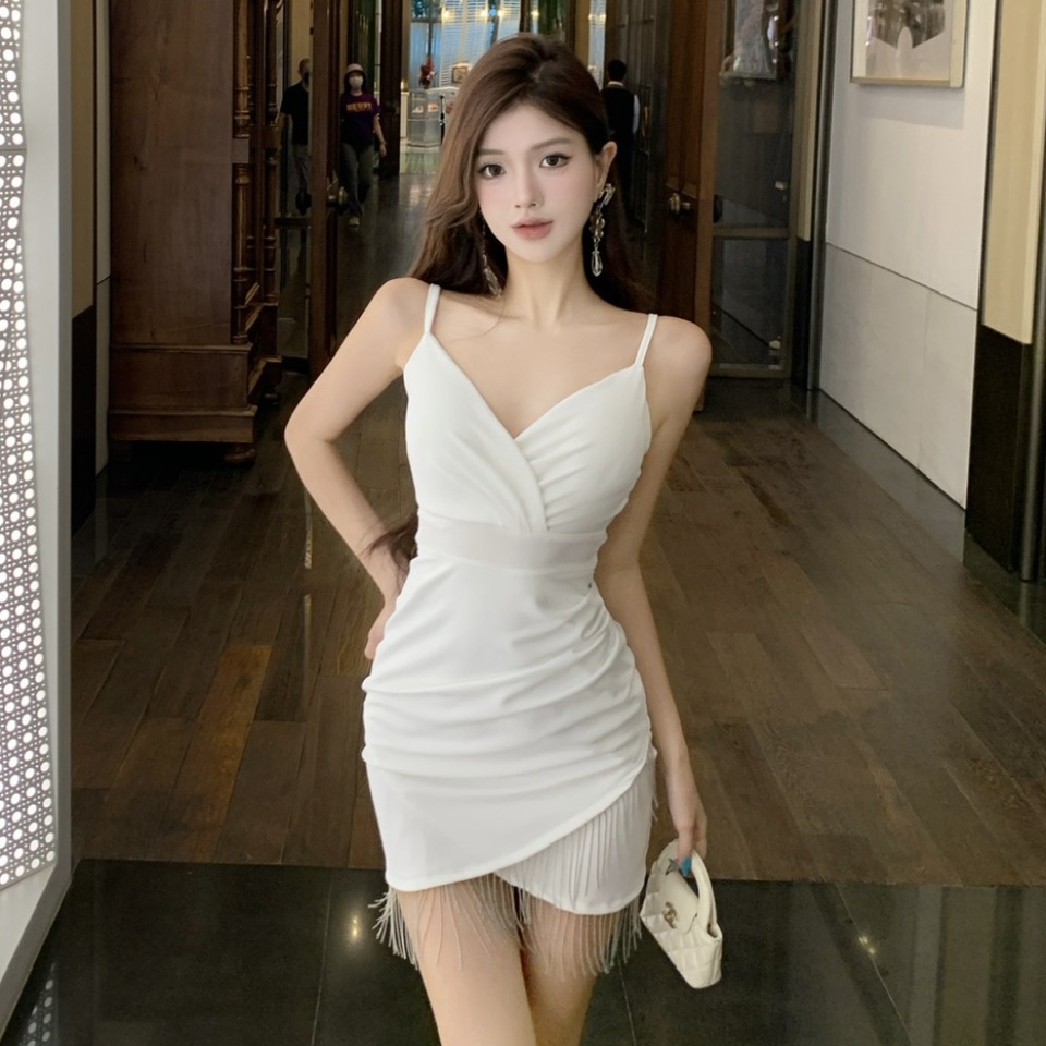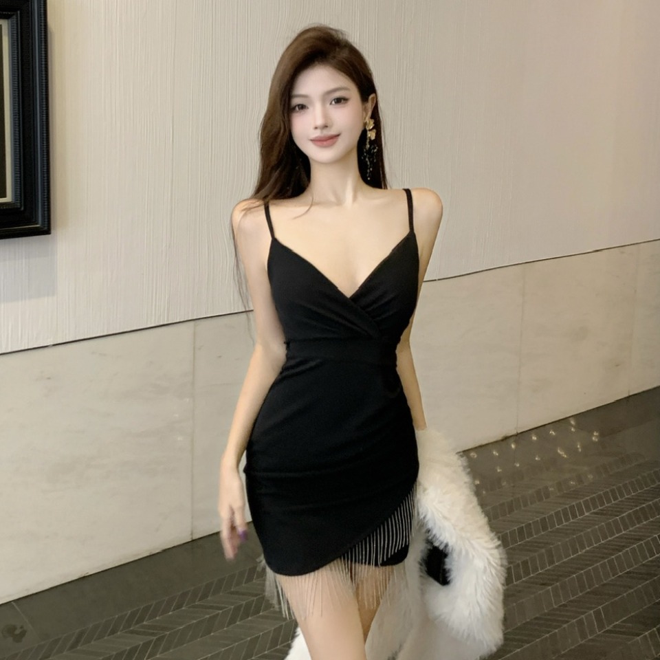 FA46709# 名媛风性感V领流苏装饰无袖吊带礼服裙纯欲辣妹露背修身连衣裙女 服裝批發女裝批發服飾貨源
