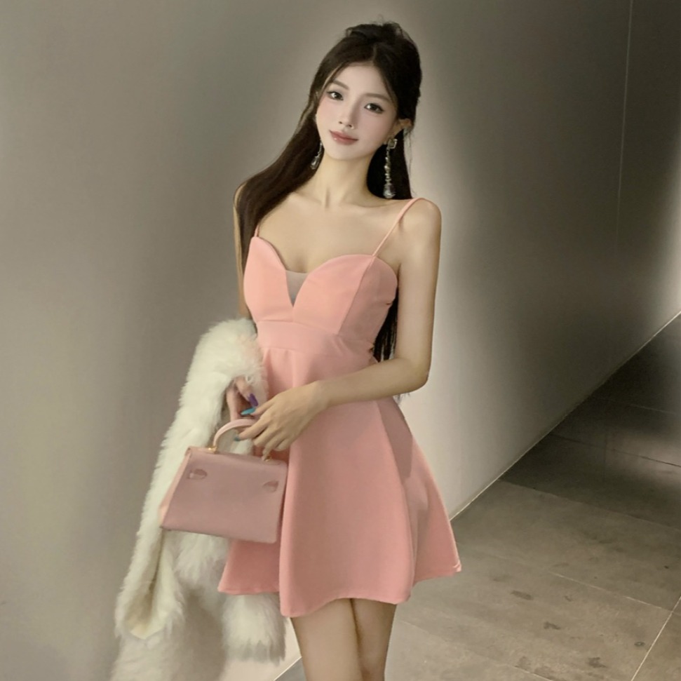 FA46710# 法式纯欲吊带低胸镂空紧身打底连衣裙女性感辣妹显瘦收腰大摆短裙 服裝批發女裝批發服飾貨源
