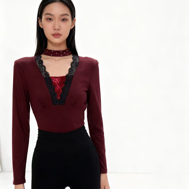 FA46866# 秋冬加厚保暖磨毛烫钻蕾丝V领围脖镶钻时尚打底小衫长袖女上衣 服裝批發女裝批發服飾貨源