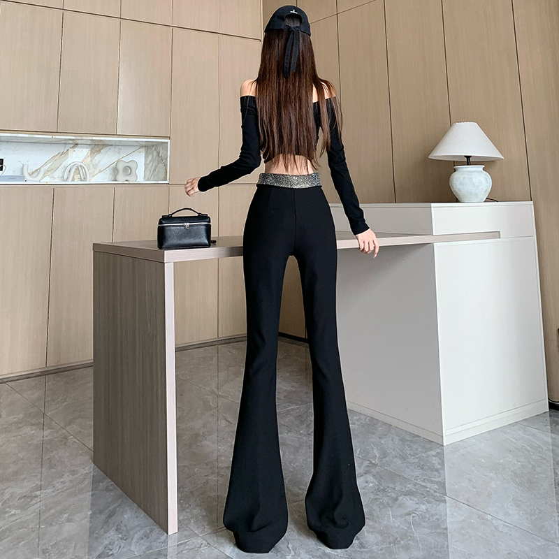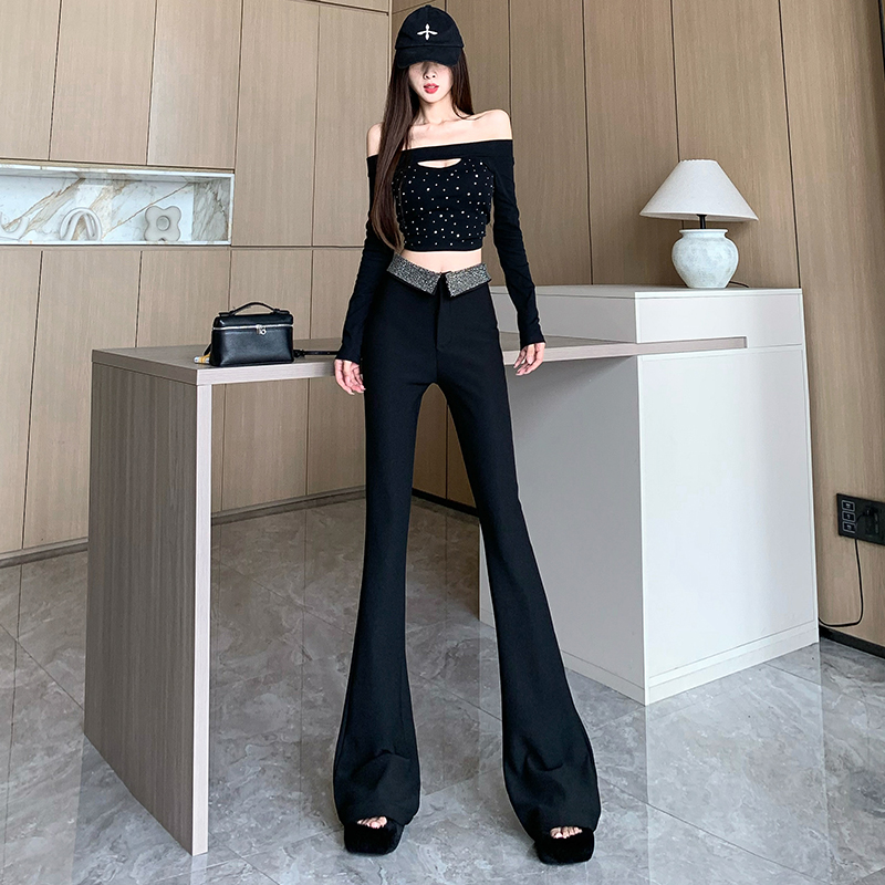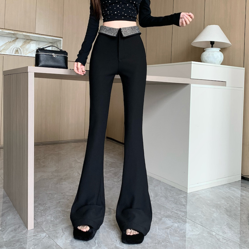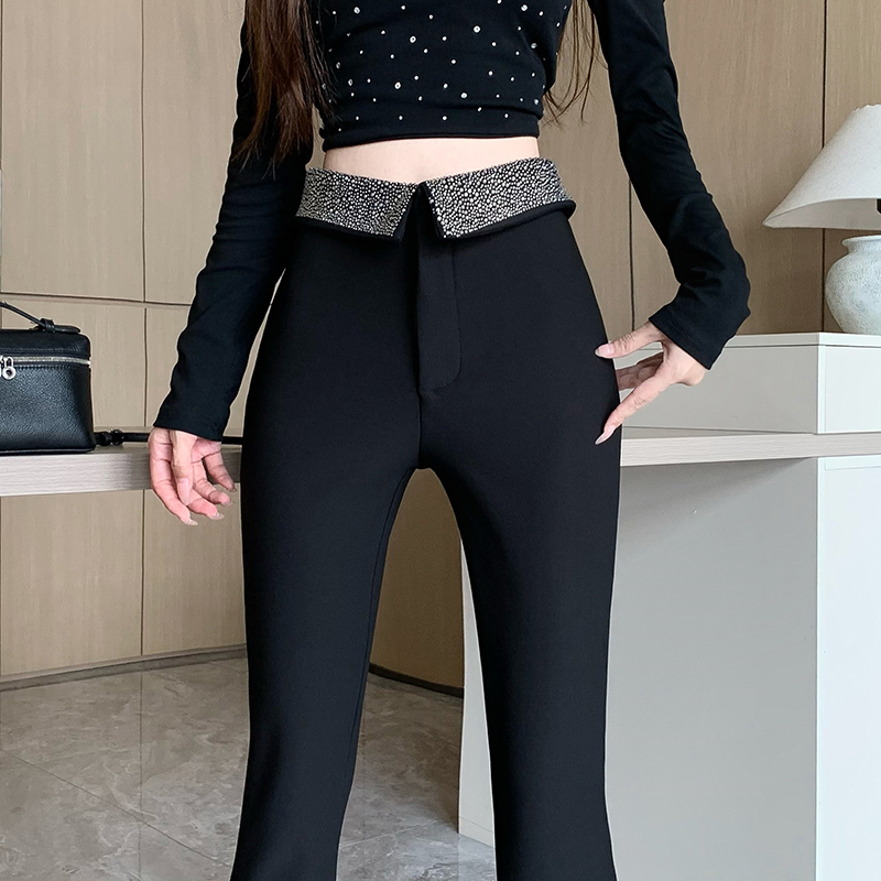 FA46871# 黑色烫钻加绒微喇休闲裤女秋冬设计翻边高腰裤修身垂感拖地喇叭裤 服裝批發女裝批發服飾貨源