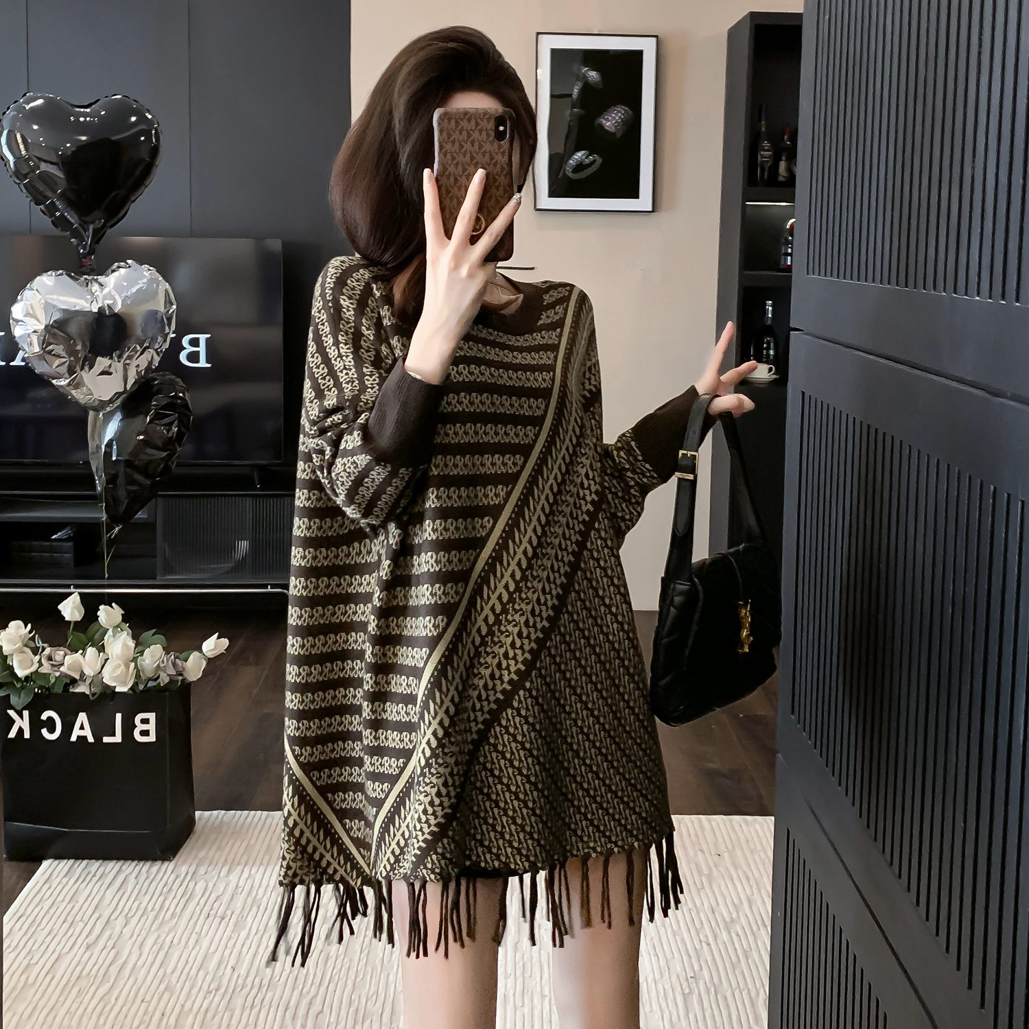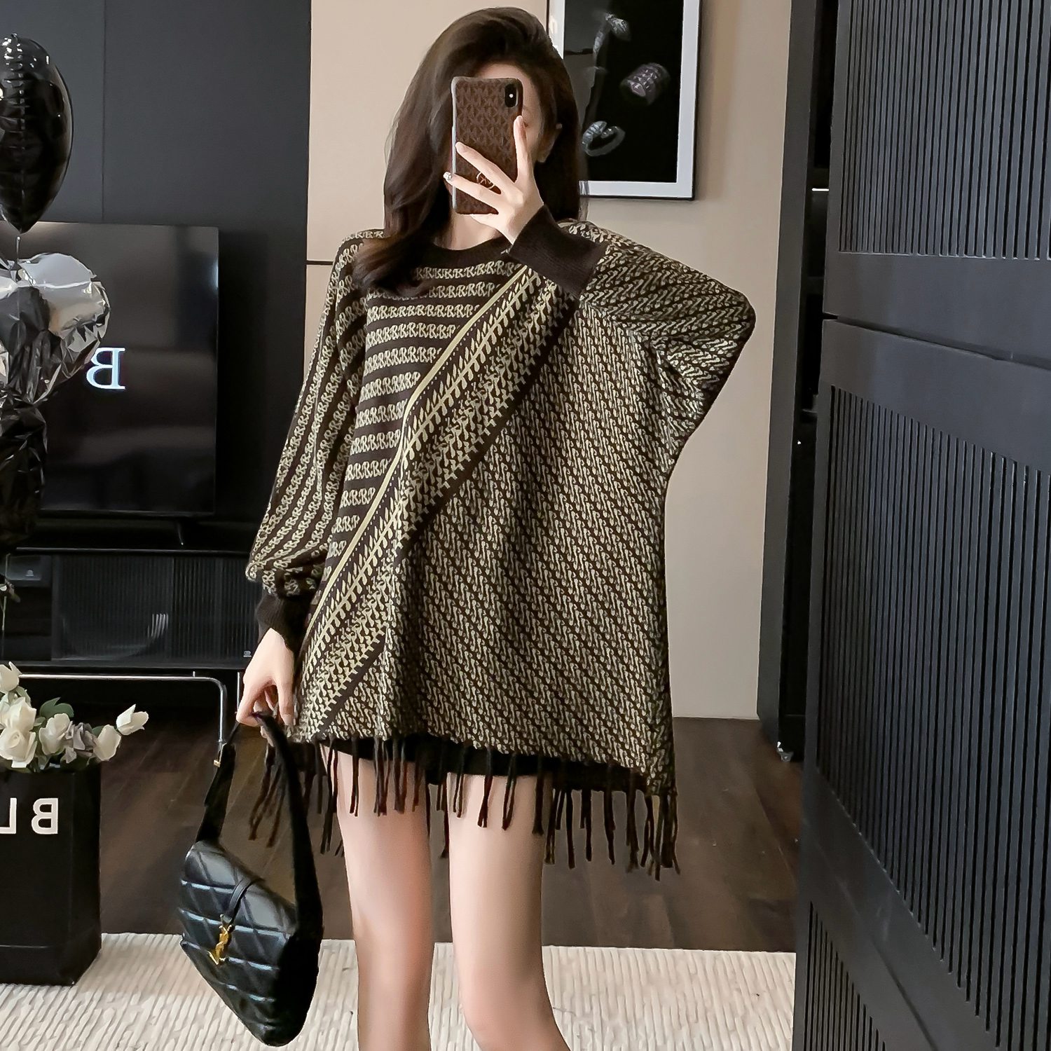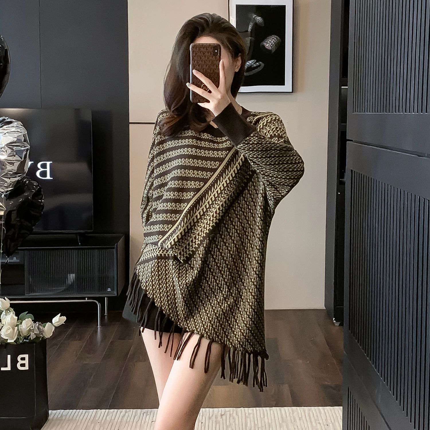 FA46884# 韩版慵懒风秋季新款休闲气质经典时尚设计感拼色流苏条纹针织衫 服裝批發女裝批發服飾貨源