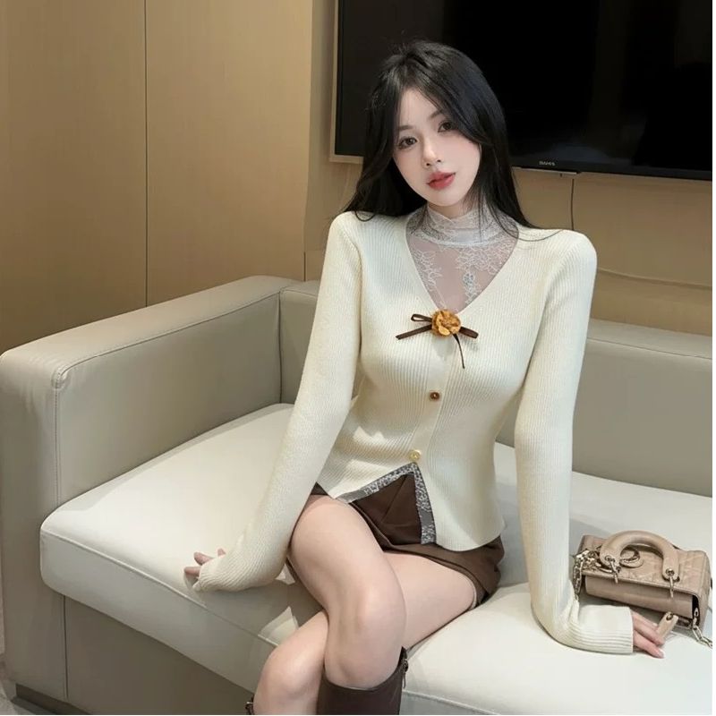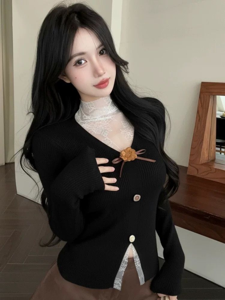 FA46825# 黑色针织衫女新款秋冬穿搭修身内搭上衣蕾丝设计感百搭毛衣 服裝批發女裝批發服飾貨源