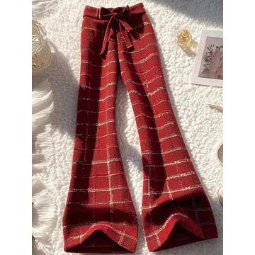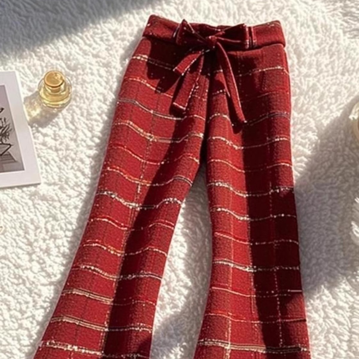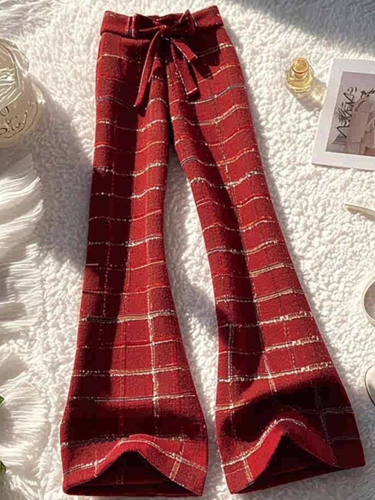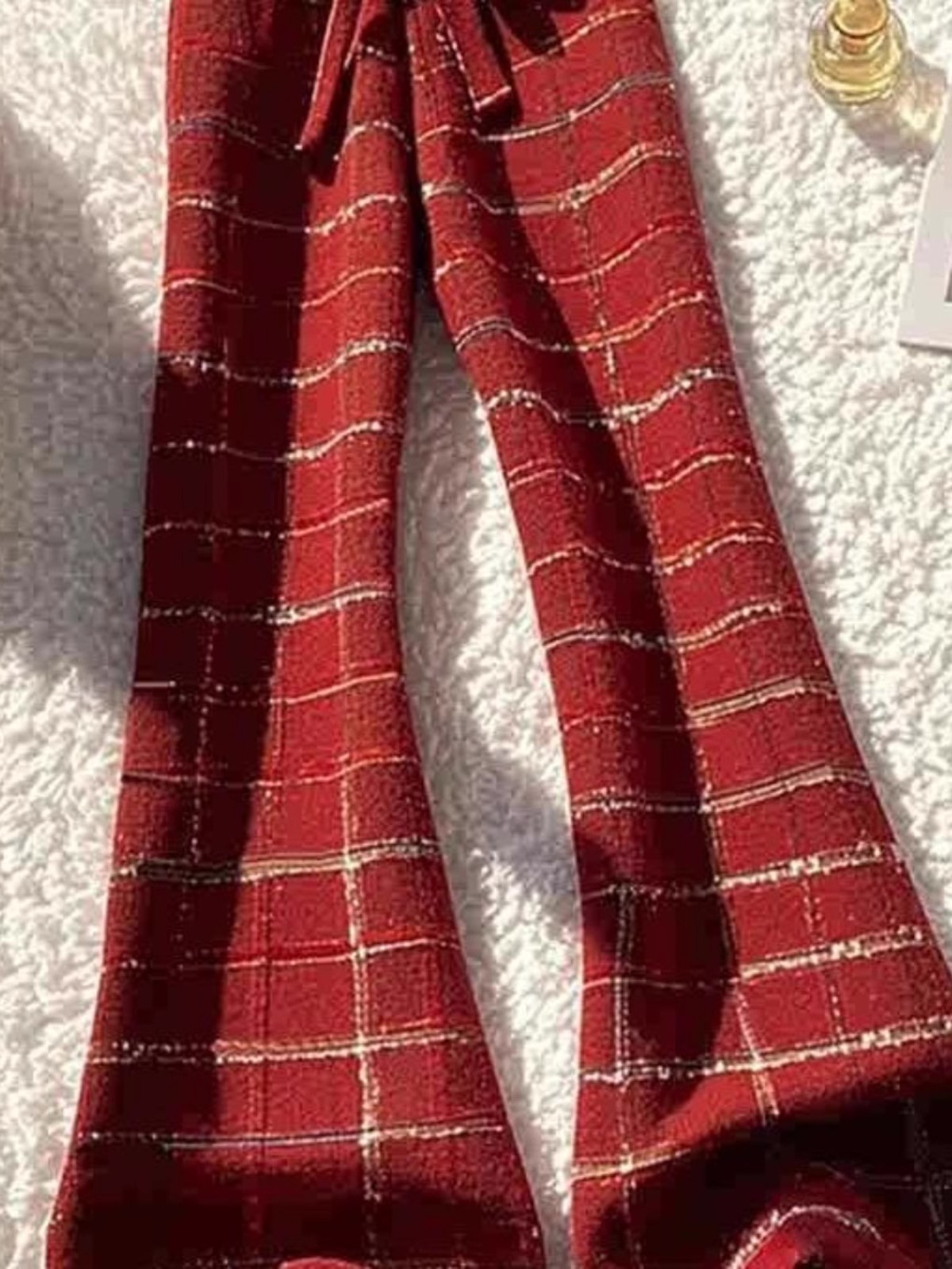 高级感洋气时髦别致高腰显瘦红色格纹微喇阔腿裤潮 服裝批發女裝批發服飾貨源