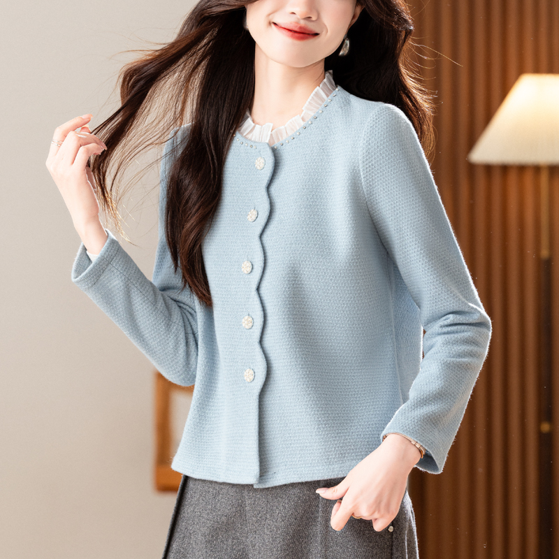 蓝色短款外套女新款秋冬钉珠木耳边绒感上衣小个子 服裝批發女裝批發服飾貨源