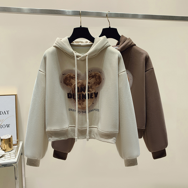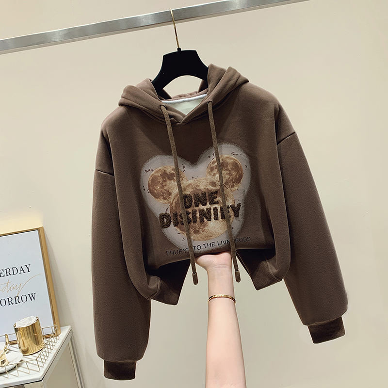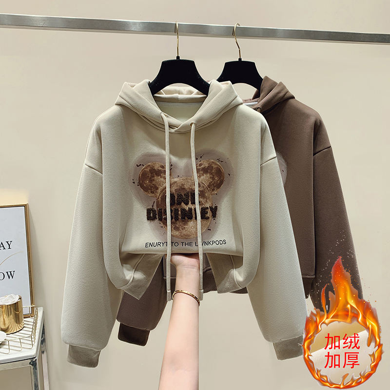 加绒加厚冬季新款连帽短款卫衣贴布印花宽松百搭长袖 服裝批發女裝批發服飾貨源