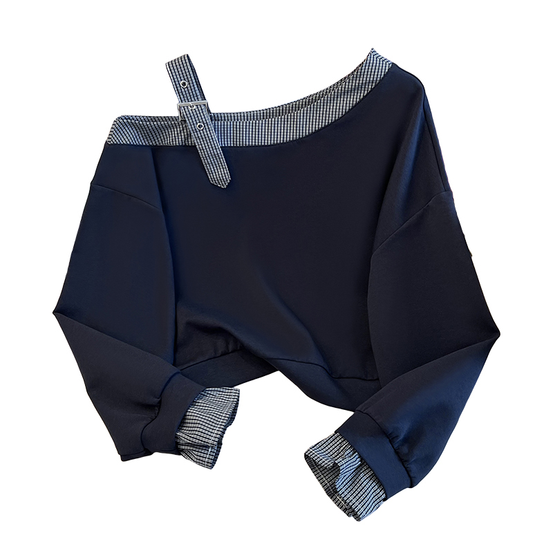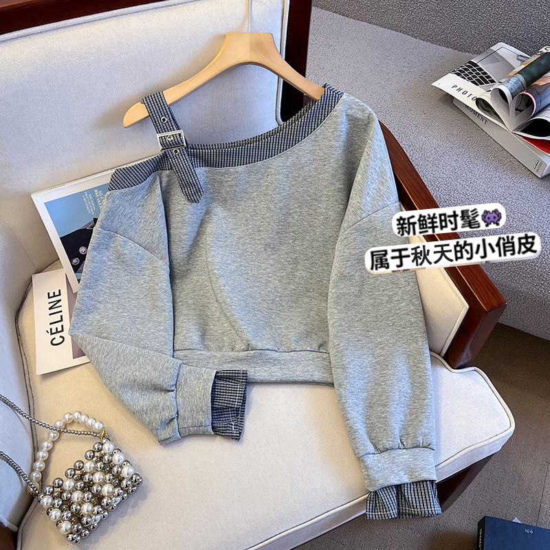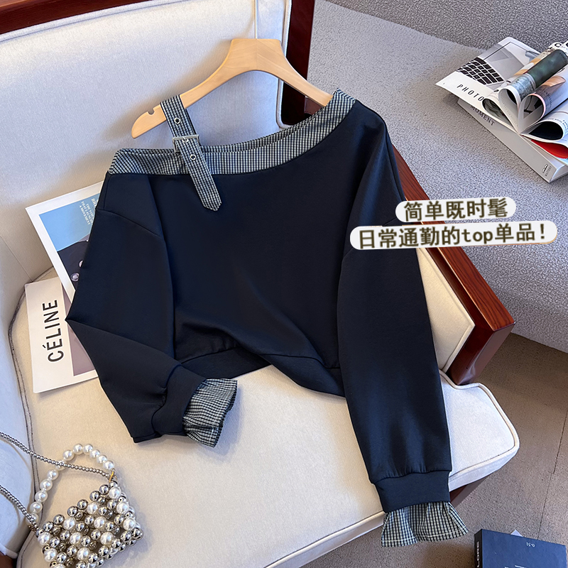 秋季新款小众设计感斜领露肩拼接上衣百搭小清新卫衣女 服裝批發女裝批發服飾貨源