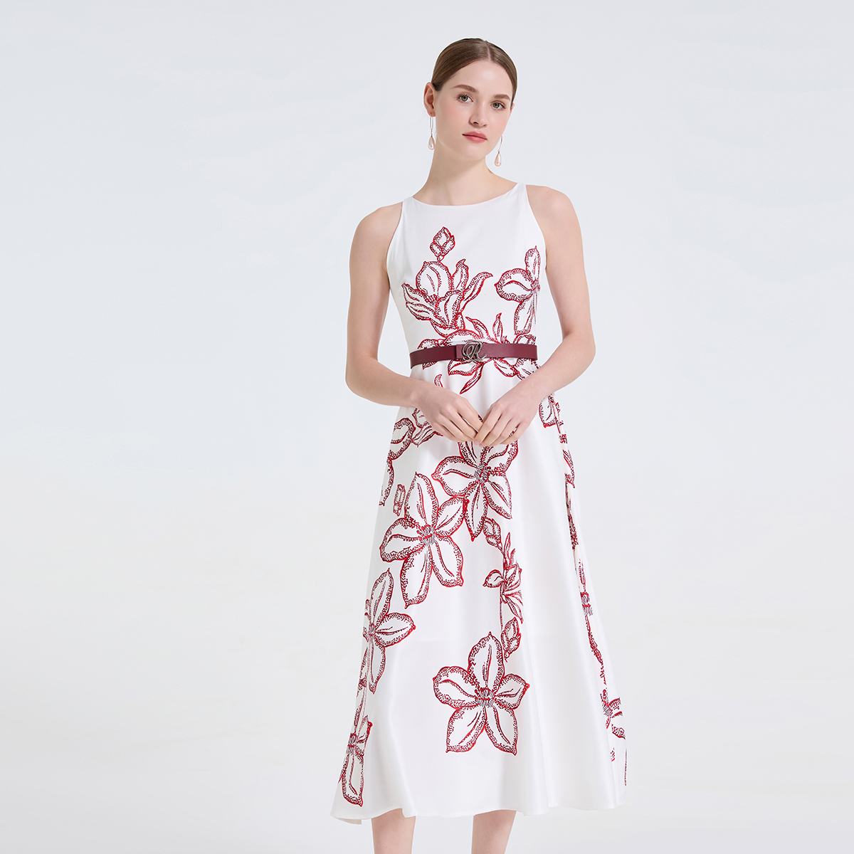 高级感立体印花圆领高腰A字裙精致腰扣显瘦气质大摆裙 服裝批發女裝批發服飾貨源