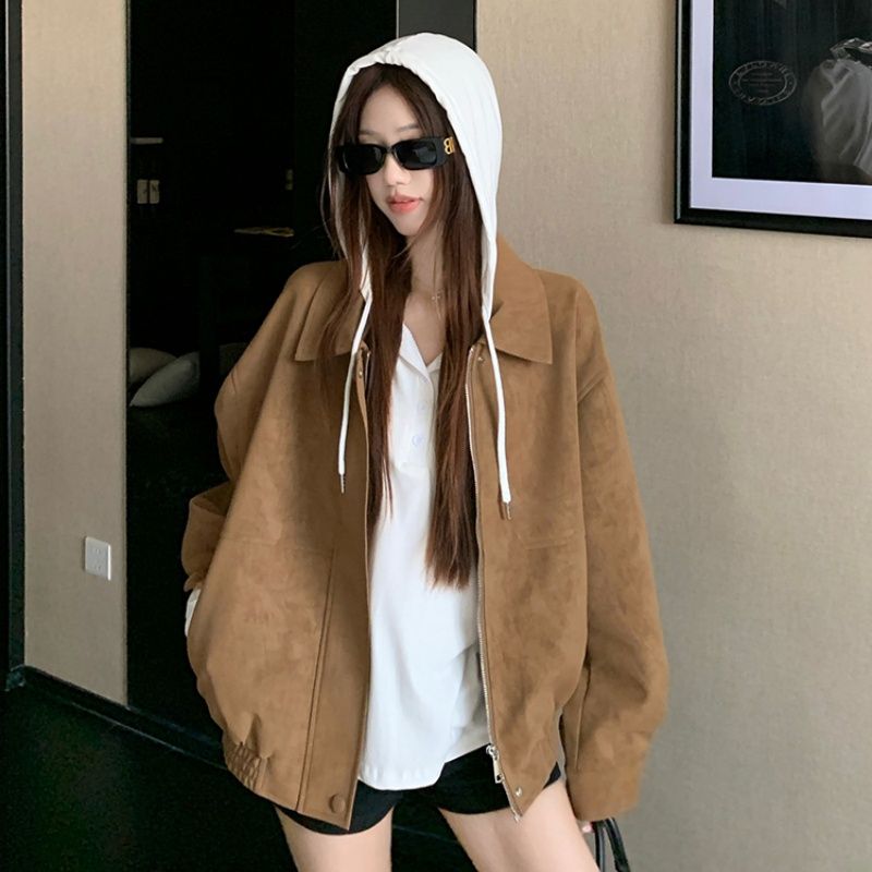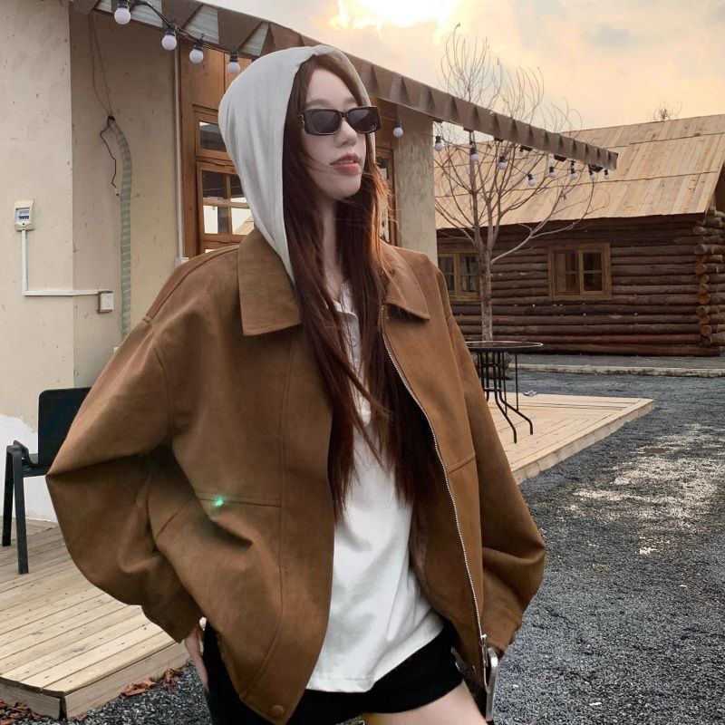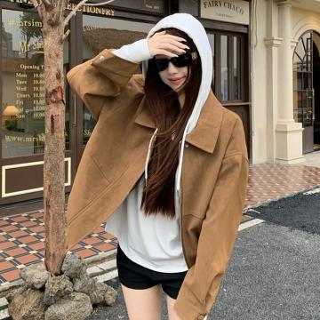 FA48773# 美拉德复古仿麂皮绒长袖外套女秋季新款宽松翻领休闲机车夹克 服裝批發女裝批發服飾貨源