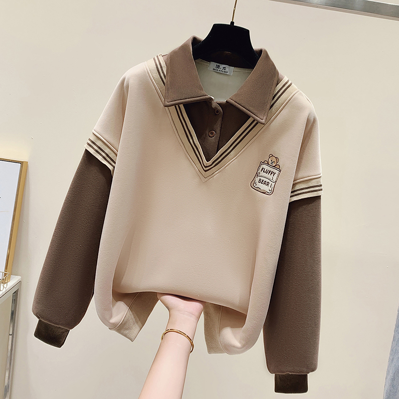 FA48882# 春季女装新款学院风polo领长袖卫衣假两件温柔风女 服裝批發女裝批發服飾貨源