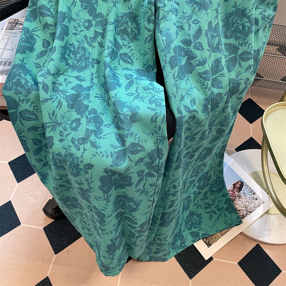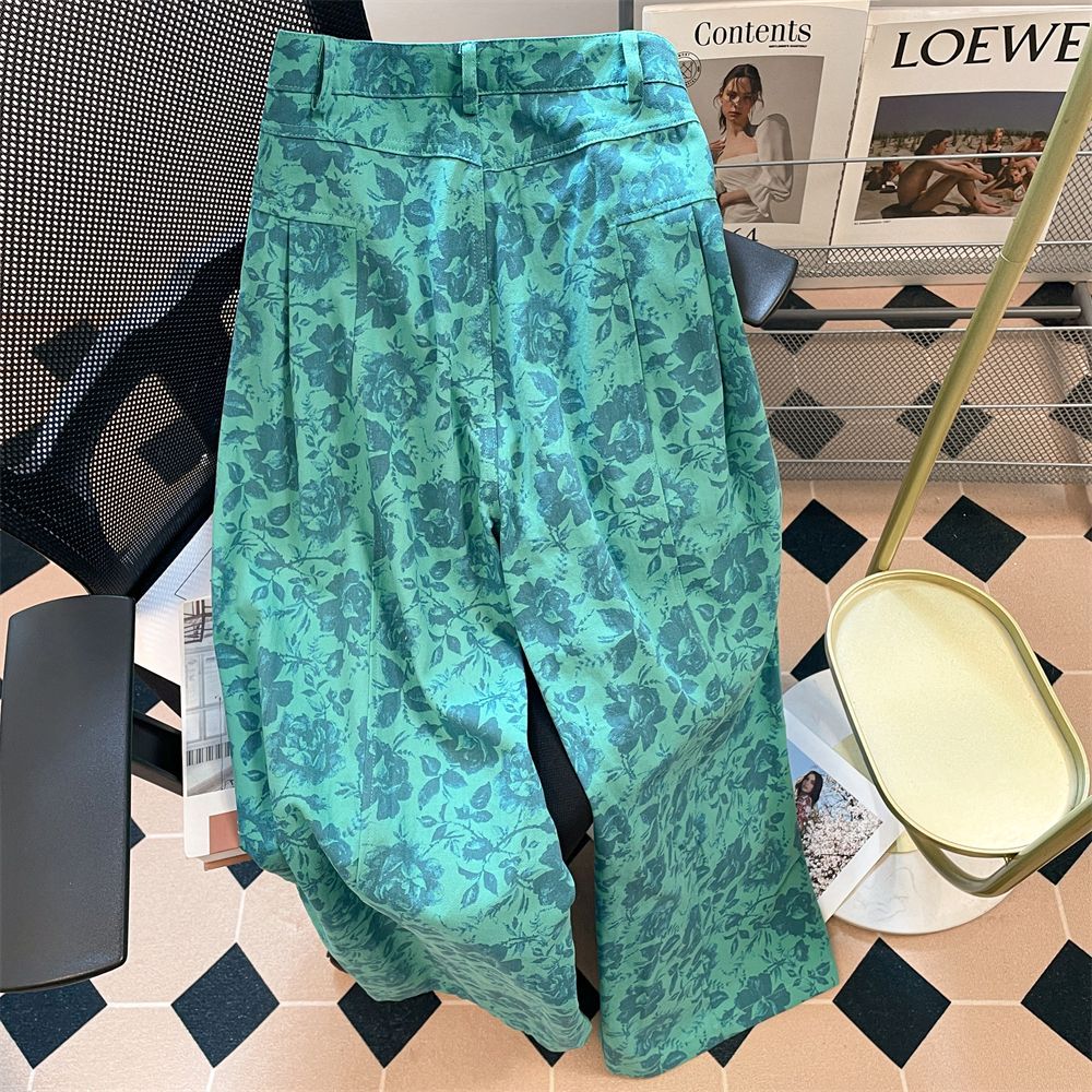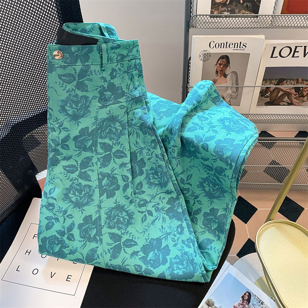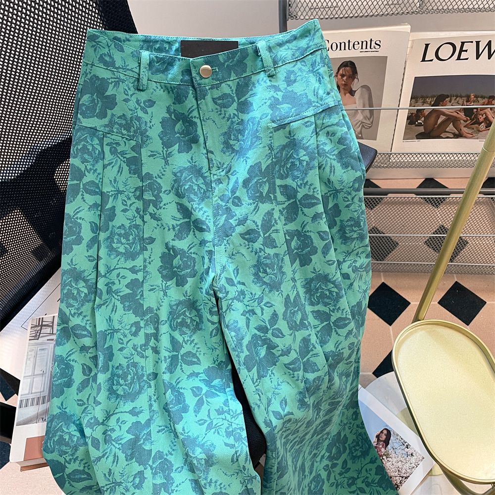 FA48918# 设计感绿色花朵印花宽松牛仔裤女美式复古直筒阔腿松弛感长裤 服裝批發女裝批發服飾貨源