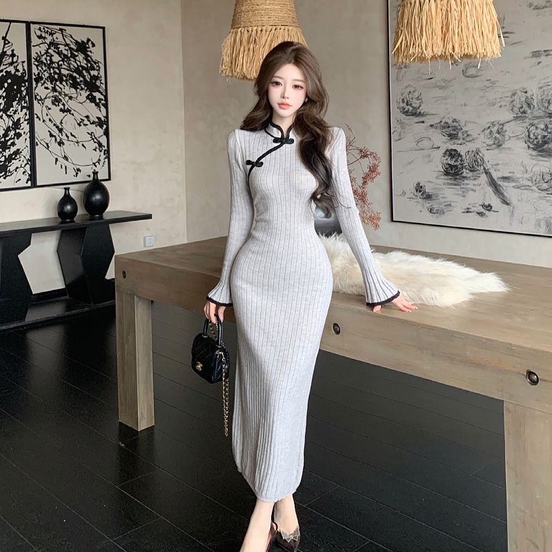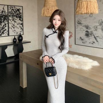FA48981# 新中式国风改良包臀旗袍长裙秋冬新款气质修身显瘦针织连衣裙 服裝批發女裝批發服飾貨源