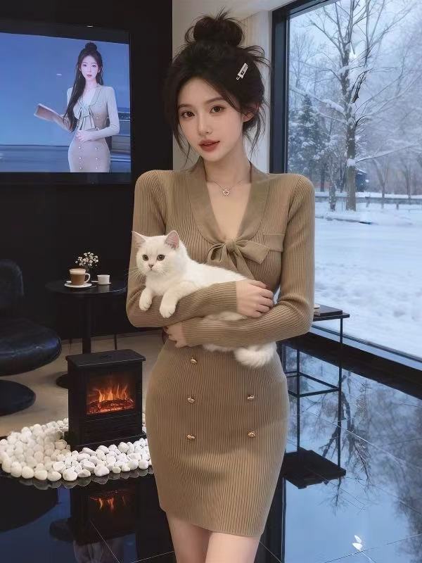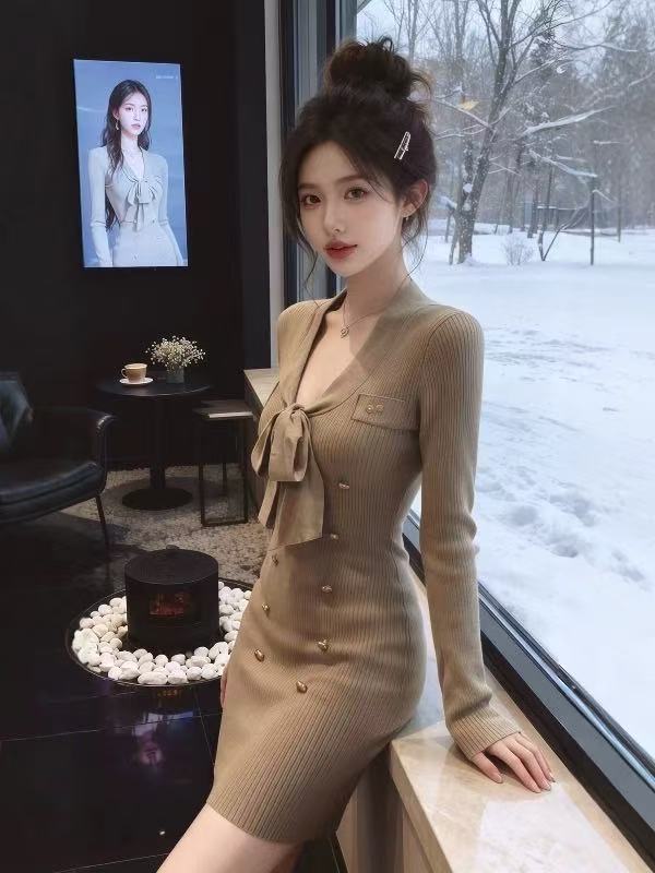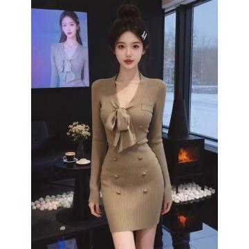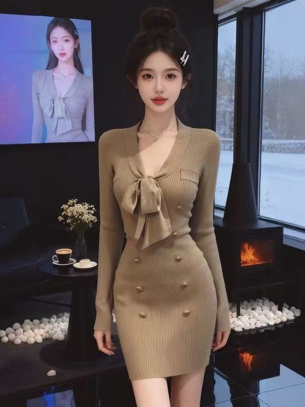 FA49004# 小香风V领蝴蝶结针织连衣裙女秋冬高级感辣妹紧身打底包臀短裙子 服裝批發女裝批發服飾貨源