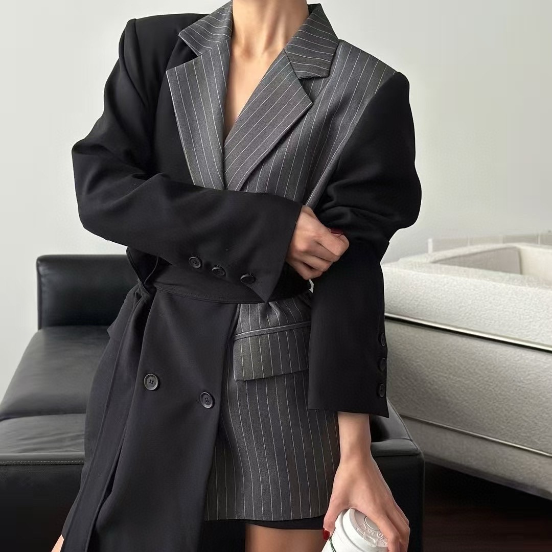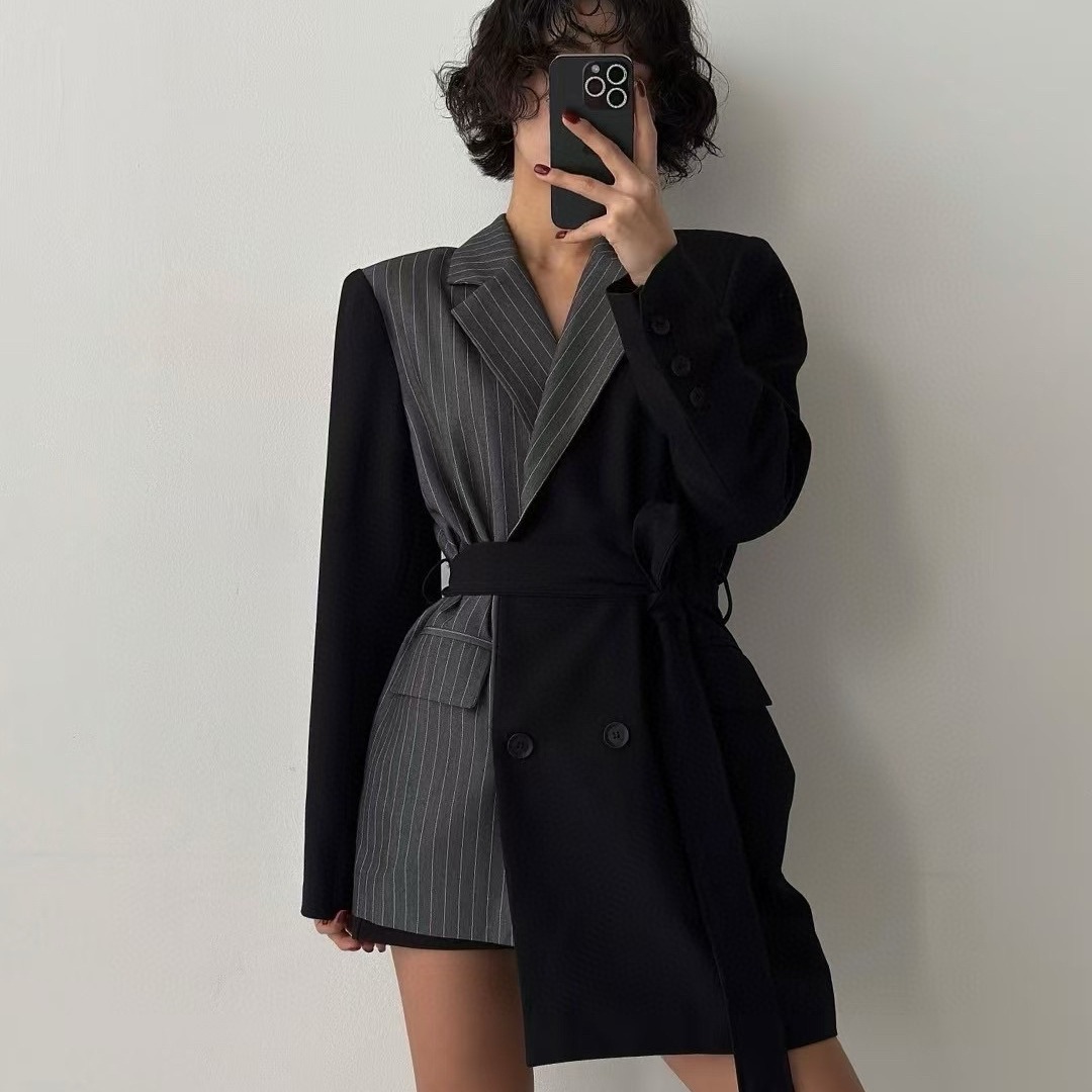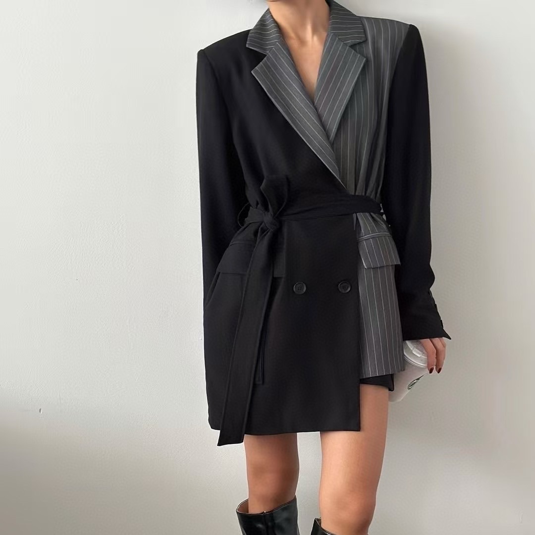 FA49115# 复古气质时尚别致不对称拼接绑带西装外套 服裝批發女裝批發服飾貨源