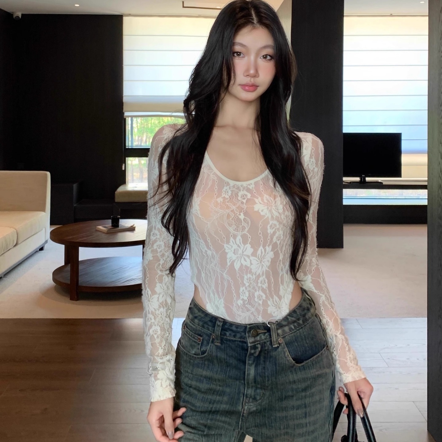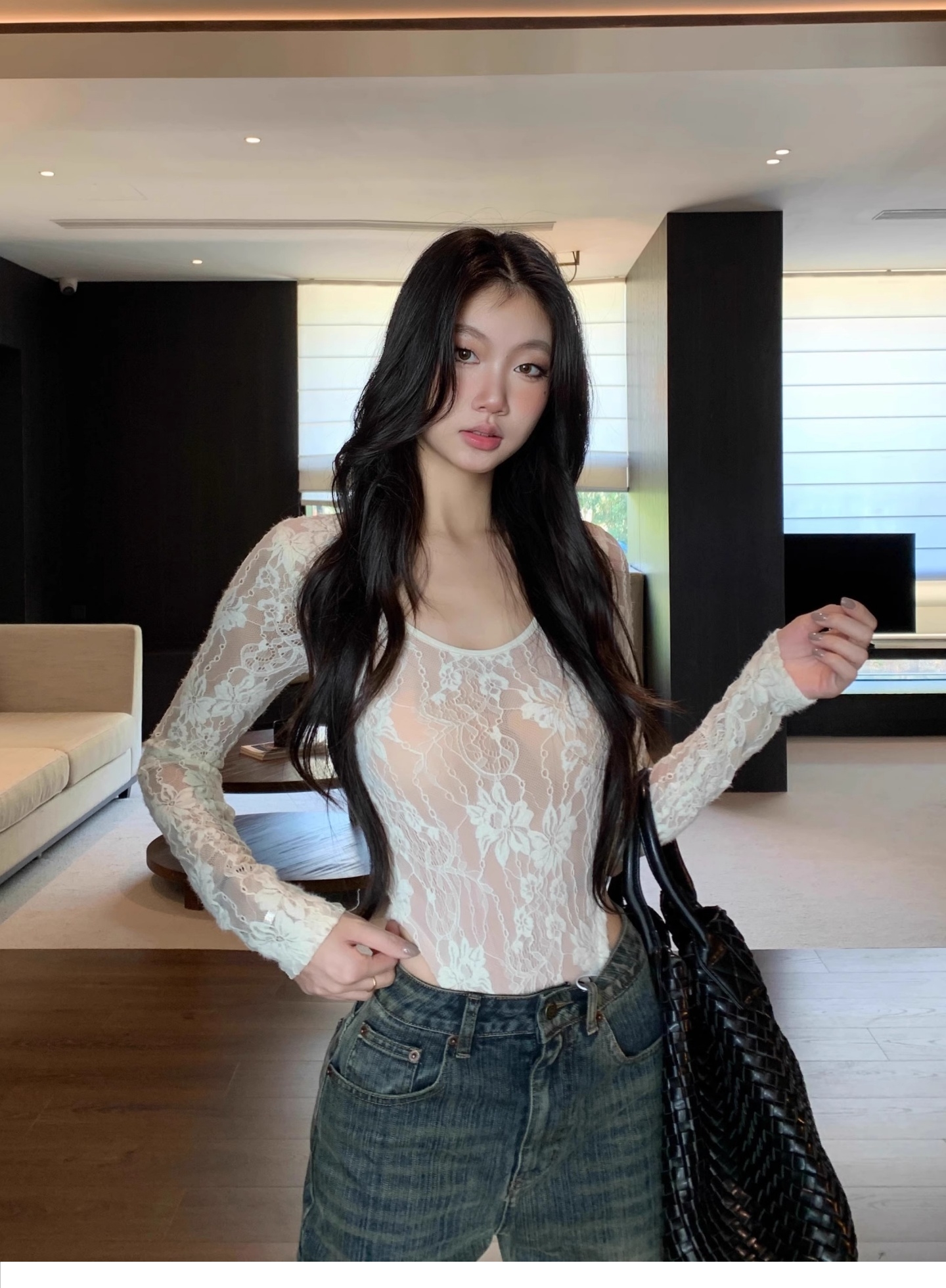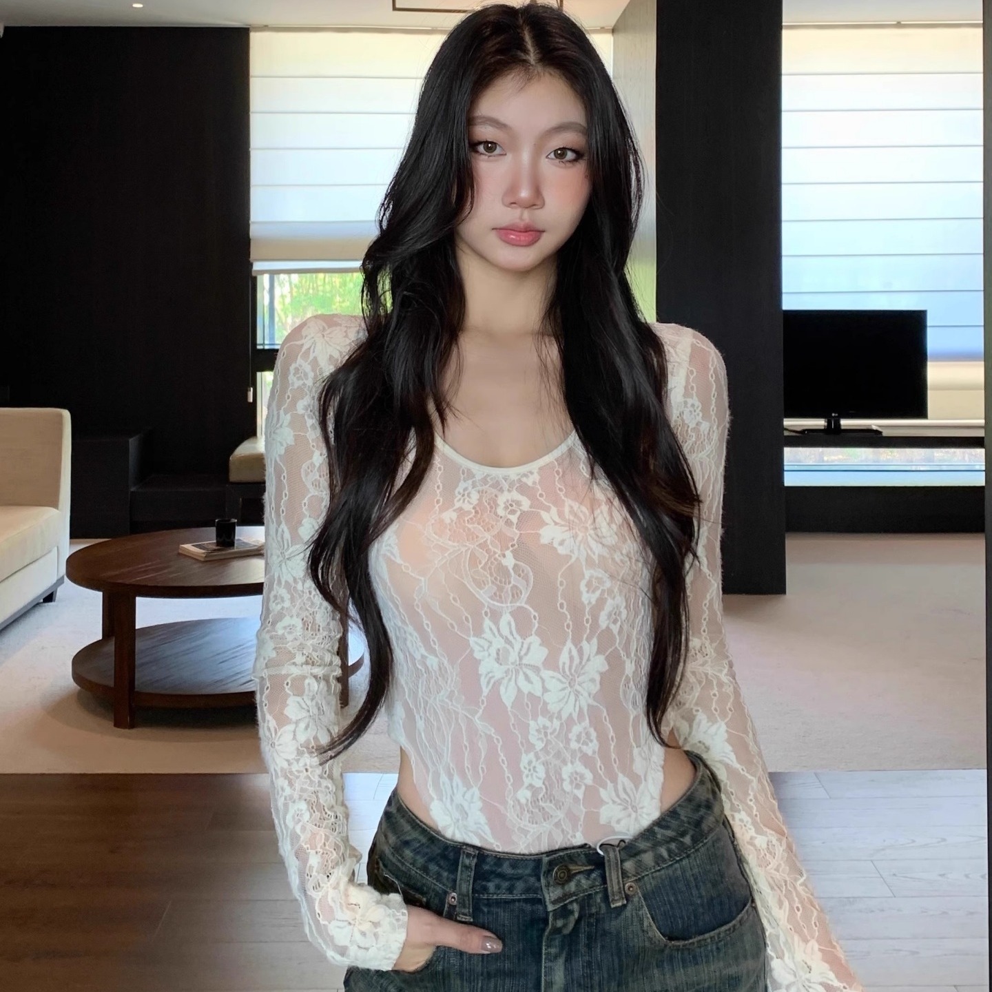 FA49131# 婉君自发热蕾丝内里磨毛带弹性双层浮雕蕾丝上衣 服裝批發女裝批發服飾貨源