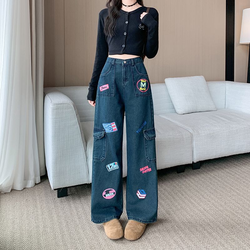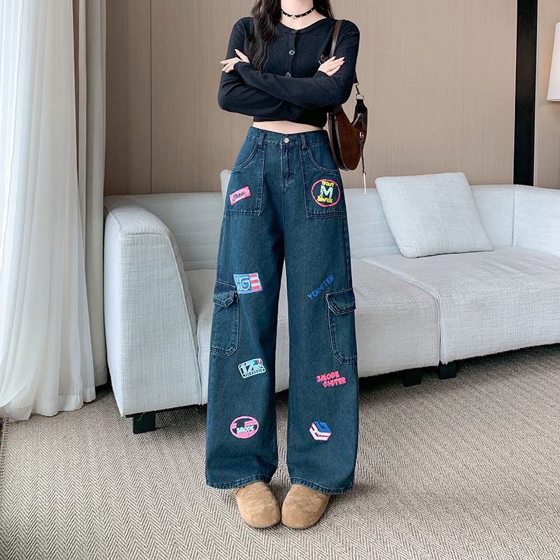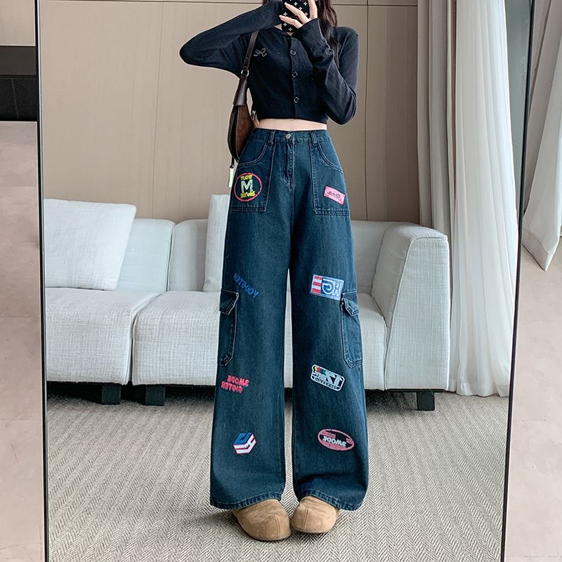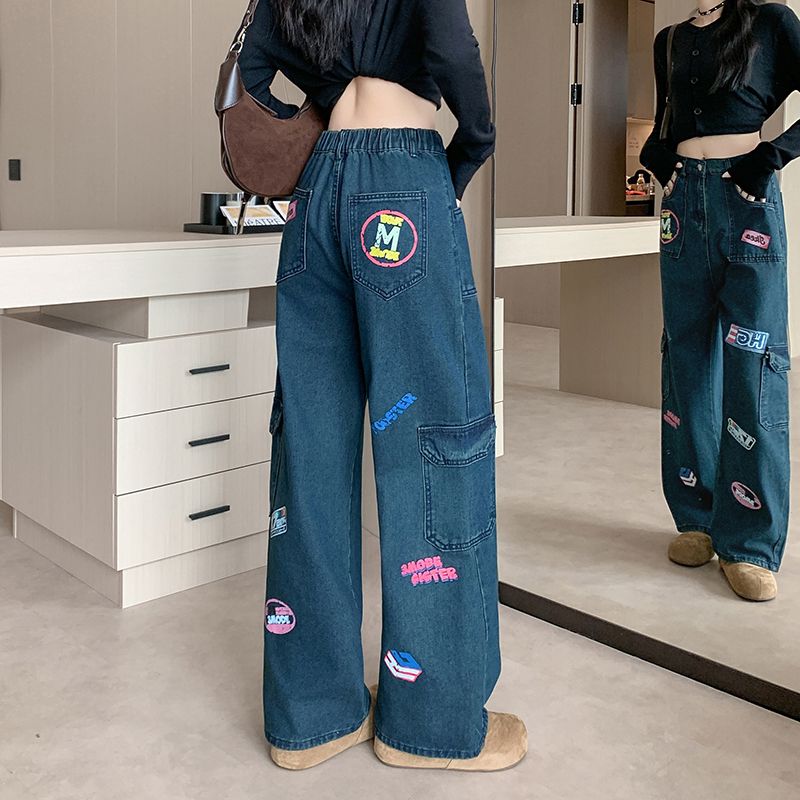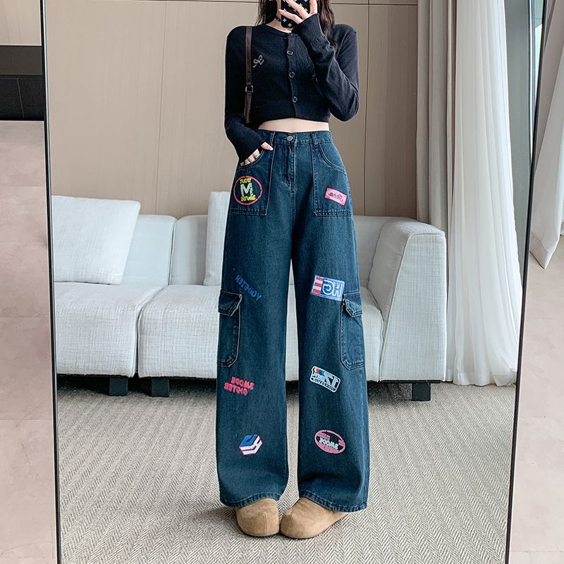 Home > 牛仔裤、长裤 > FA49162# 美式复古邮票印花工装牛仔裤女高街小众宽松阔腿直筒裤 服裝批發女裝批發服飾貨源