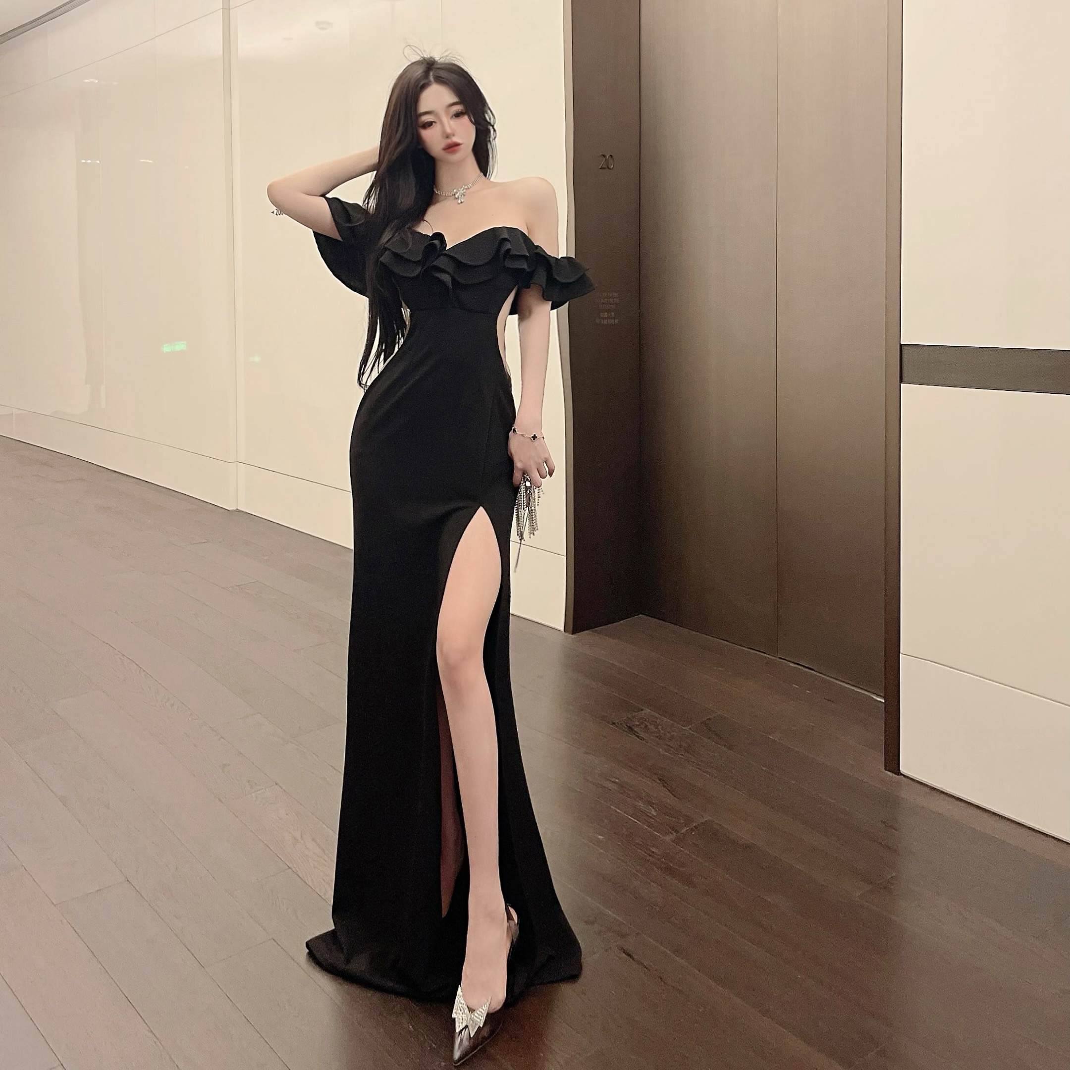 新款露背一字肩名媛性感露背包臀开叉连衣裙