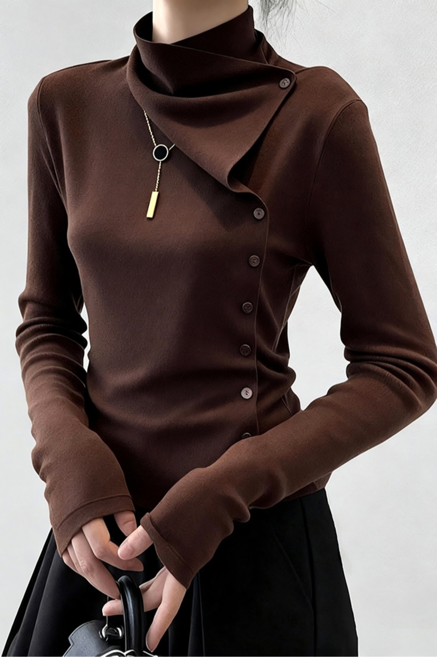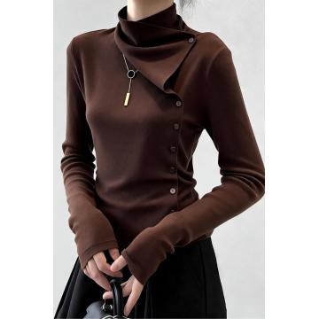 FA49579# 秋冬季独特复古半高领针织打底衫女内搭高级设计感棕色不规则上衣