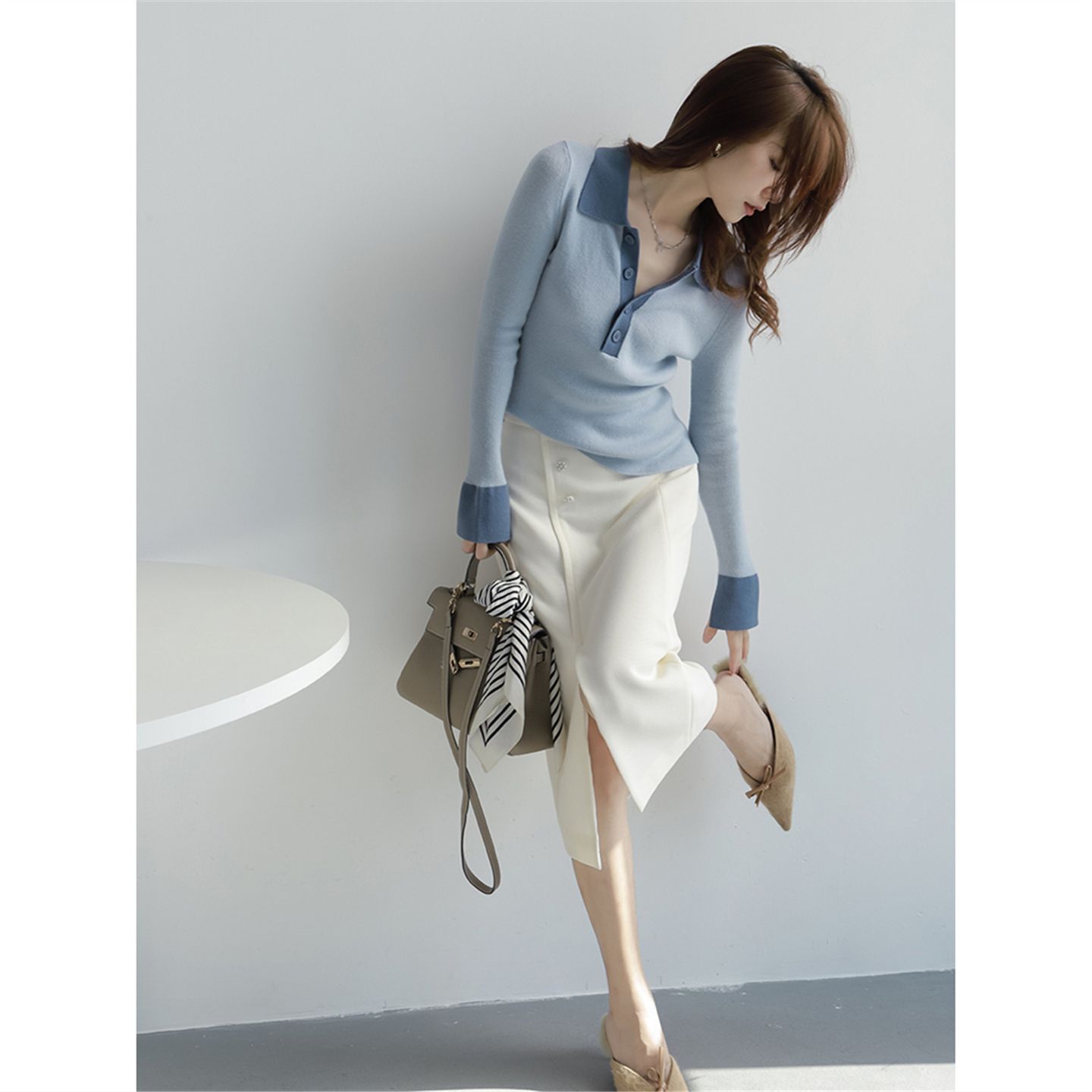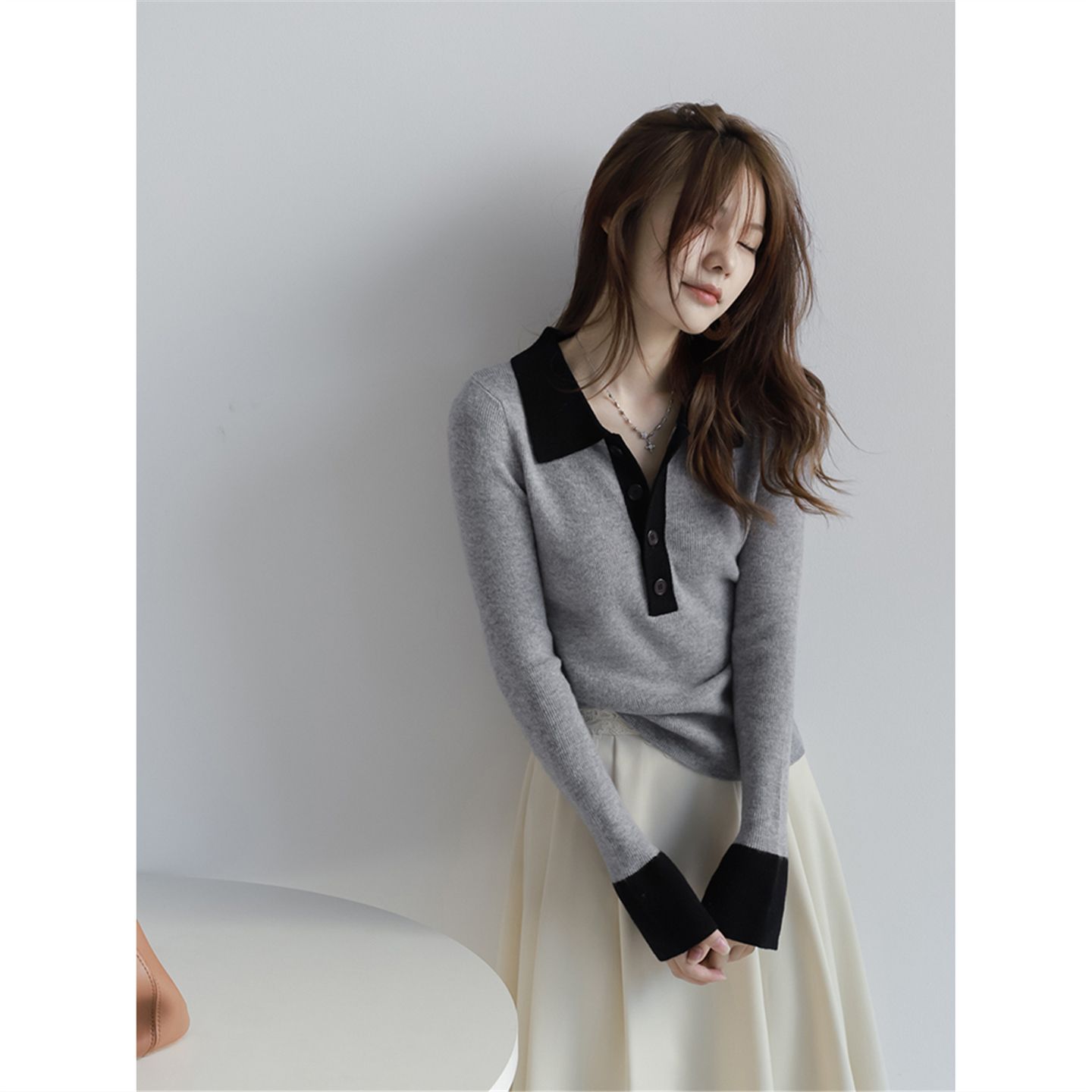 FA49590# 包芯纱设计感小众Polo领撞色打底针织衫毛衣女