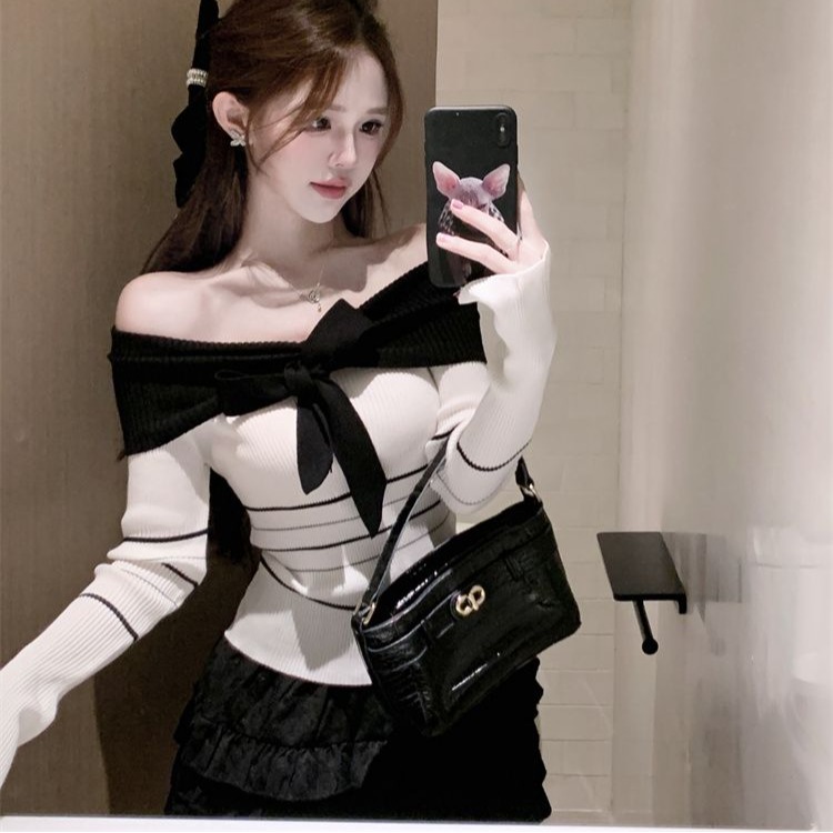 FA49613# 气质设计感撞色条纹一字肩毛衣针织衫女秋季短款露肩上衣