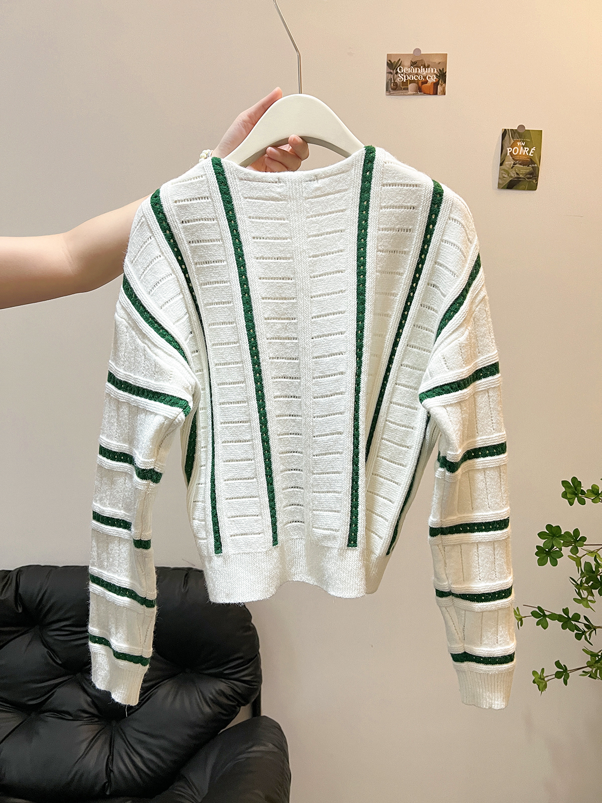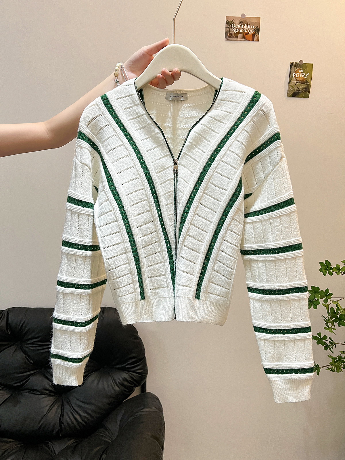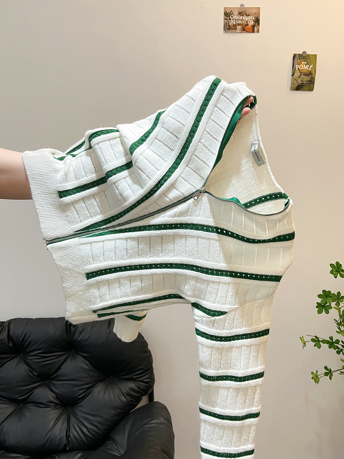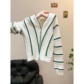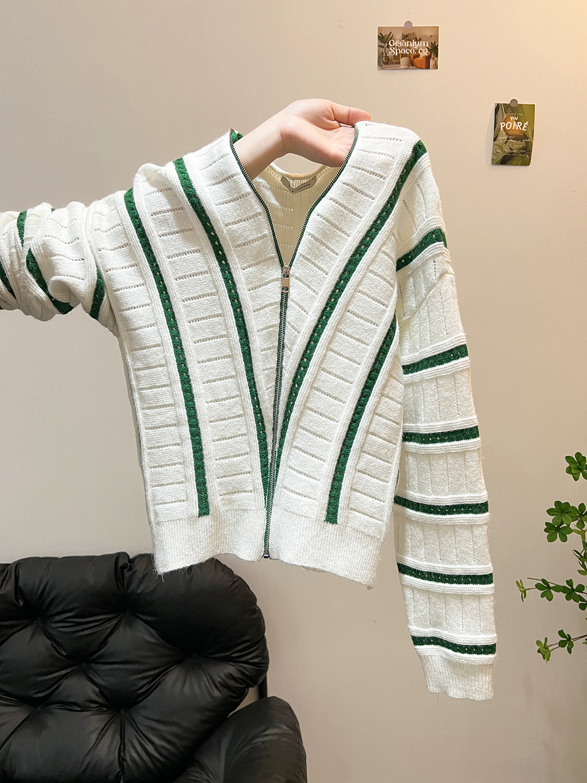FA49621# 秋季小众不撞款高级感超好看慵懒风韩系松弛感绿色条纹针织开衫女