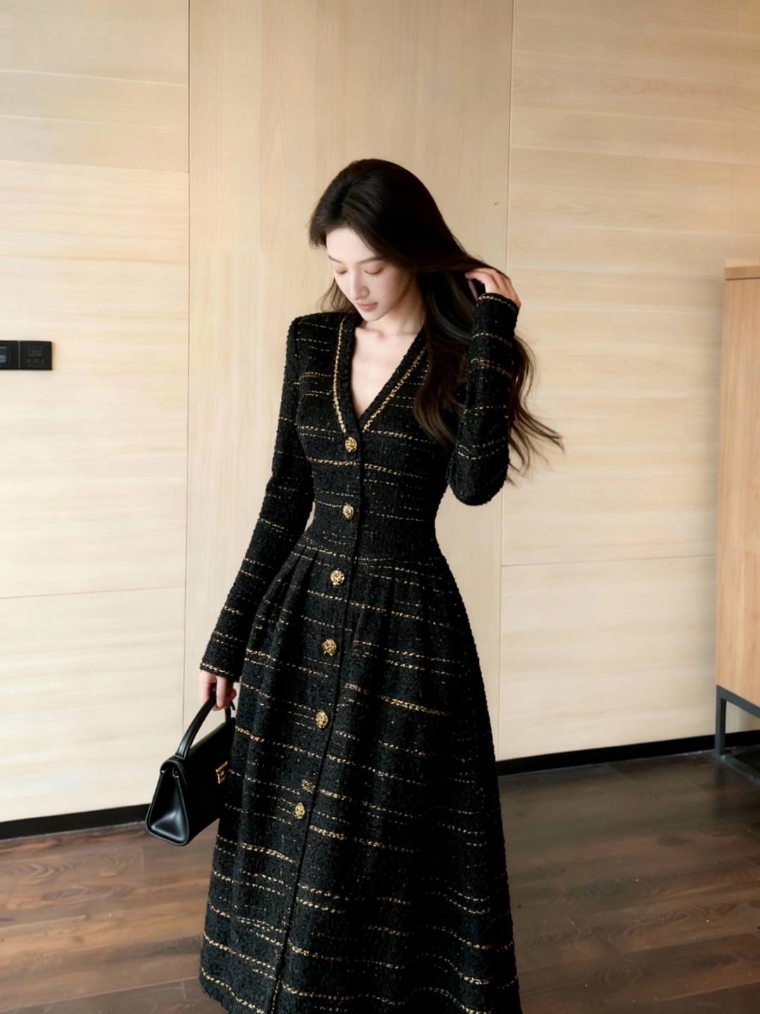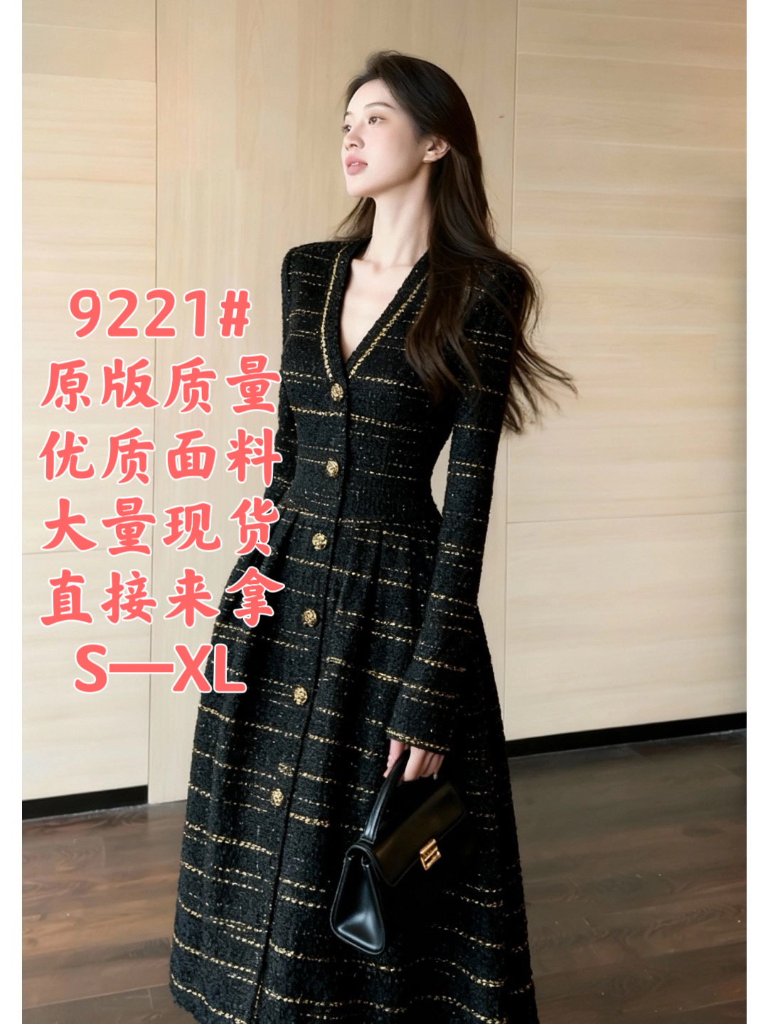 FA49898# 秋季巨好看富家千金miu系黑色小香风气质v领连衣裙女新款 服裝批發女裝批發服飾貨源