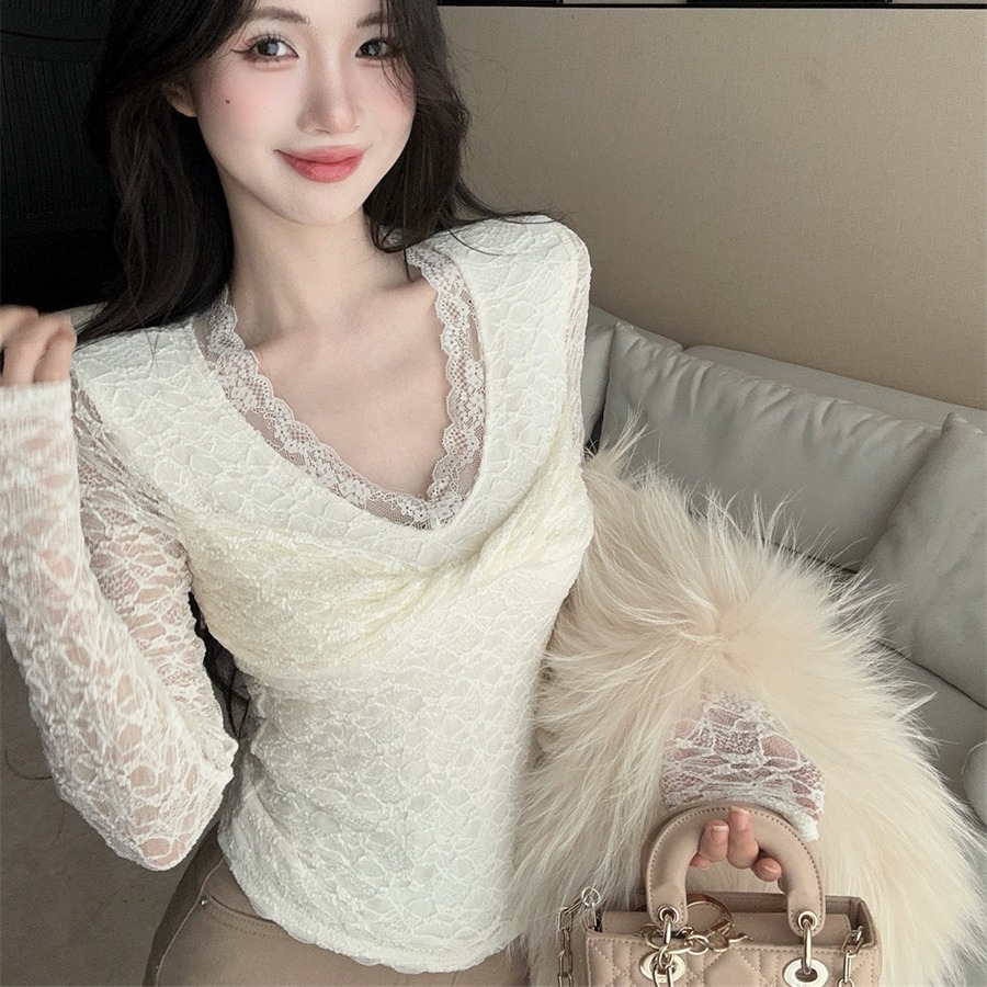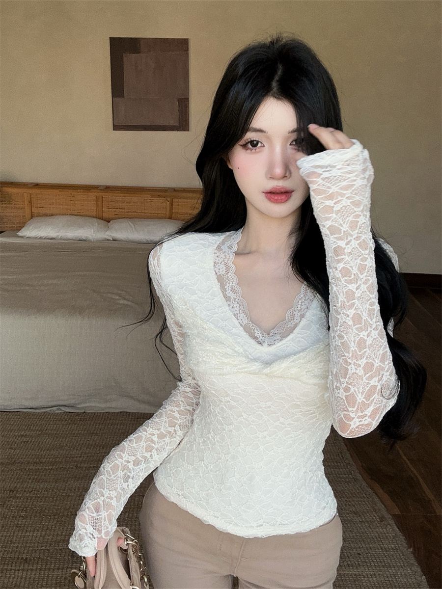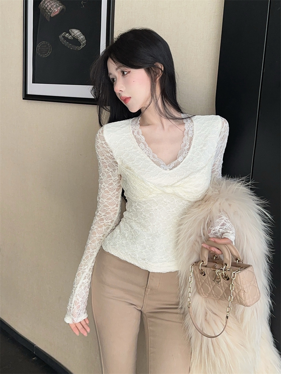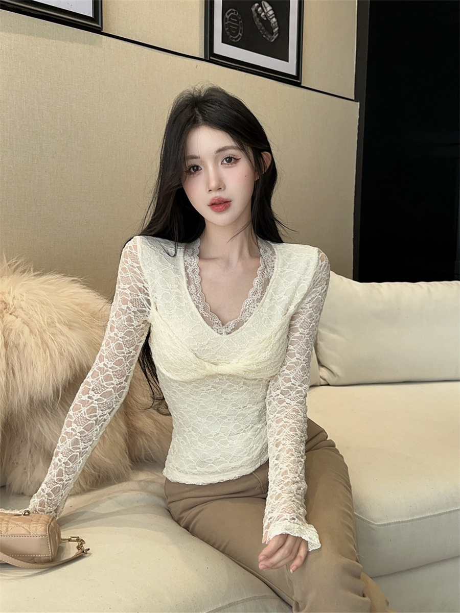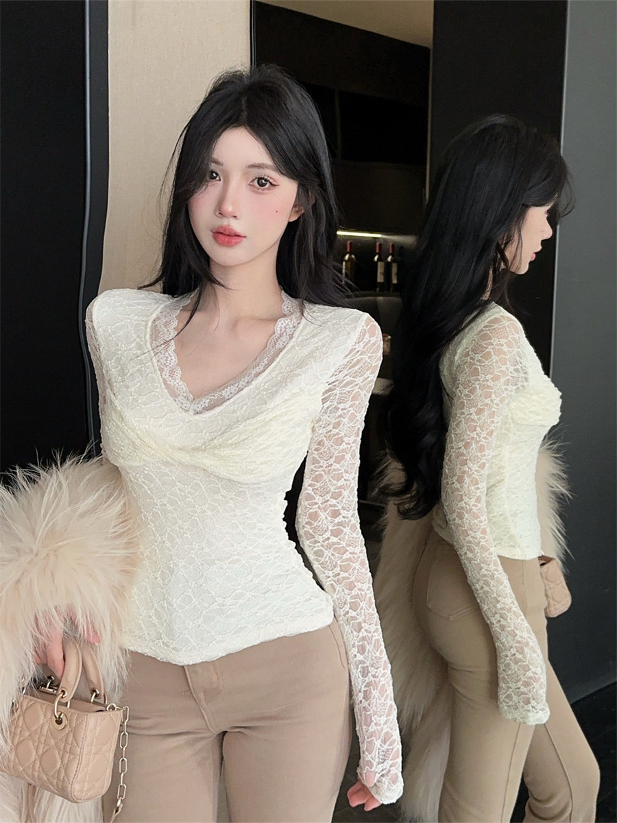 Home > 长袖雪纺衫、衬衫、上衣 > FA50208# 设计感御姐轻熟薄绒扭结v领蕾丝花边打底衫长袖T恤女 服裝批發女裝批發服飾貨源
