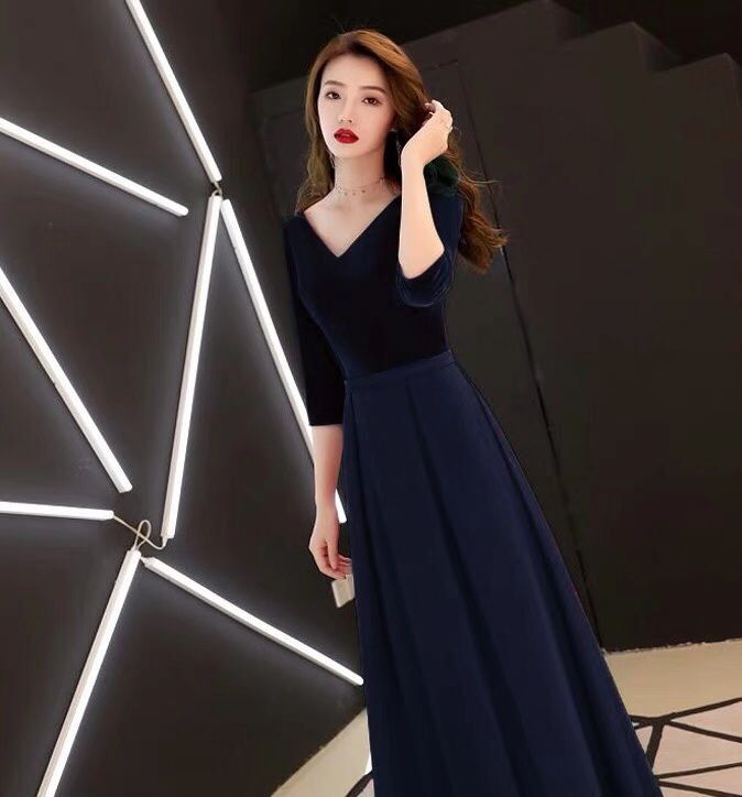 FA50217# 宴会晚礼服时尚中袖大码演出服韩版修身显瘦V领礼服裙 服裝批發女裝批發服飾貨源