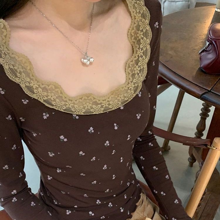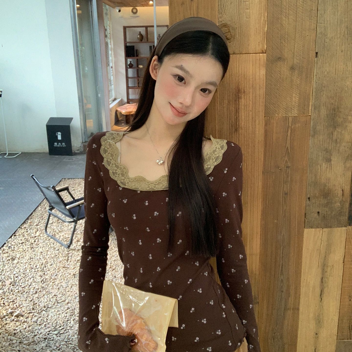 FA50225# 美式辣妹碎花创意蕾丝拼接长袖t恤显瘦修身德绒保暖打底衫上衣女 服裝批發女裝批發服飾貨源