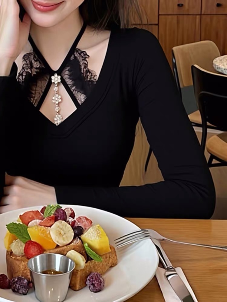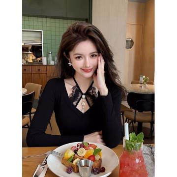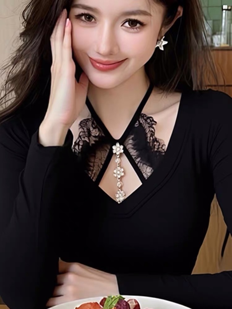 FA50228# 性感甜辣妹黑色挂脖蕾丝拼接长袖t恤上衣秋冬季修身显瘦打底衫女 服裝批發女裝批發服飾貨源