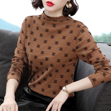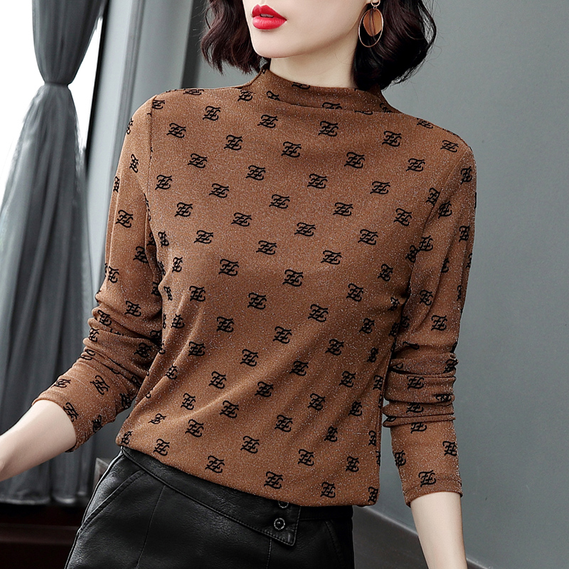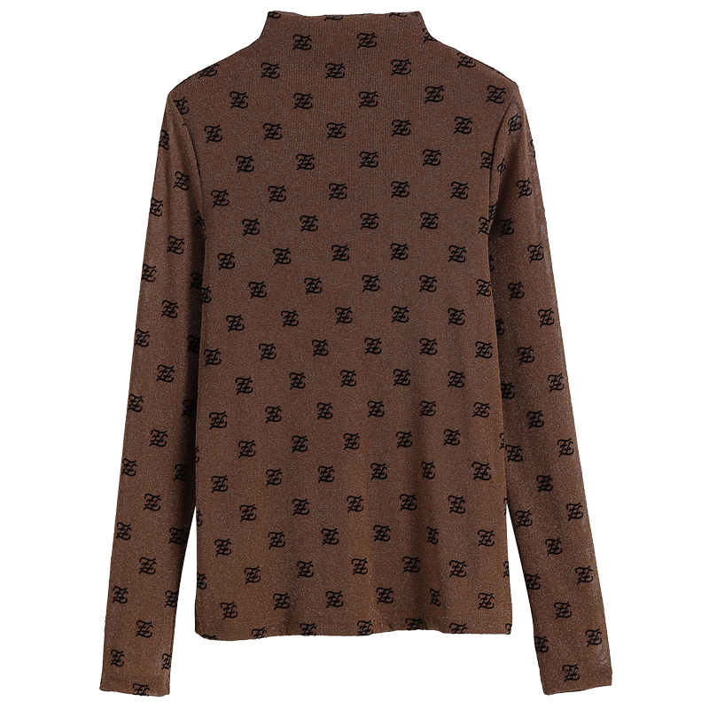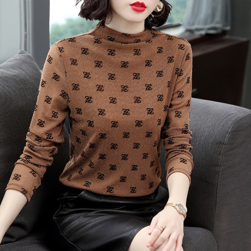 FA50260# 半高领打底衫秋冬新款外穿印花网纱上衣洋气长袖t恤女 服裝批發女裝批發服飾貨源