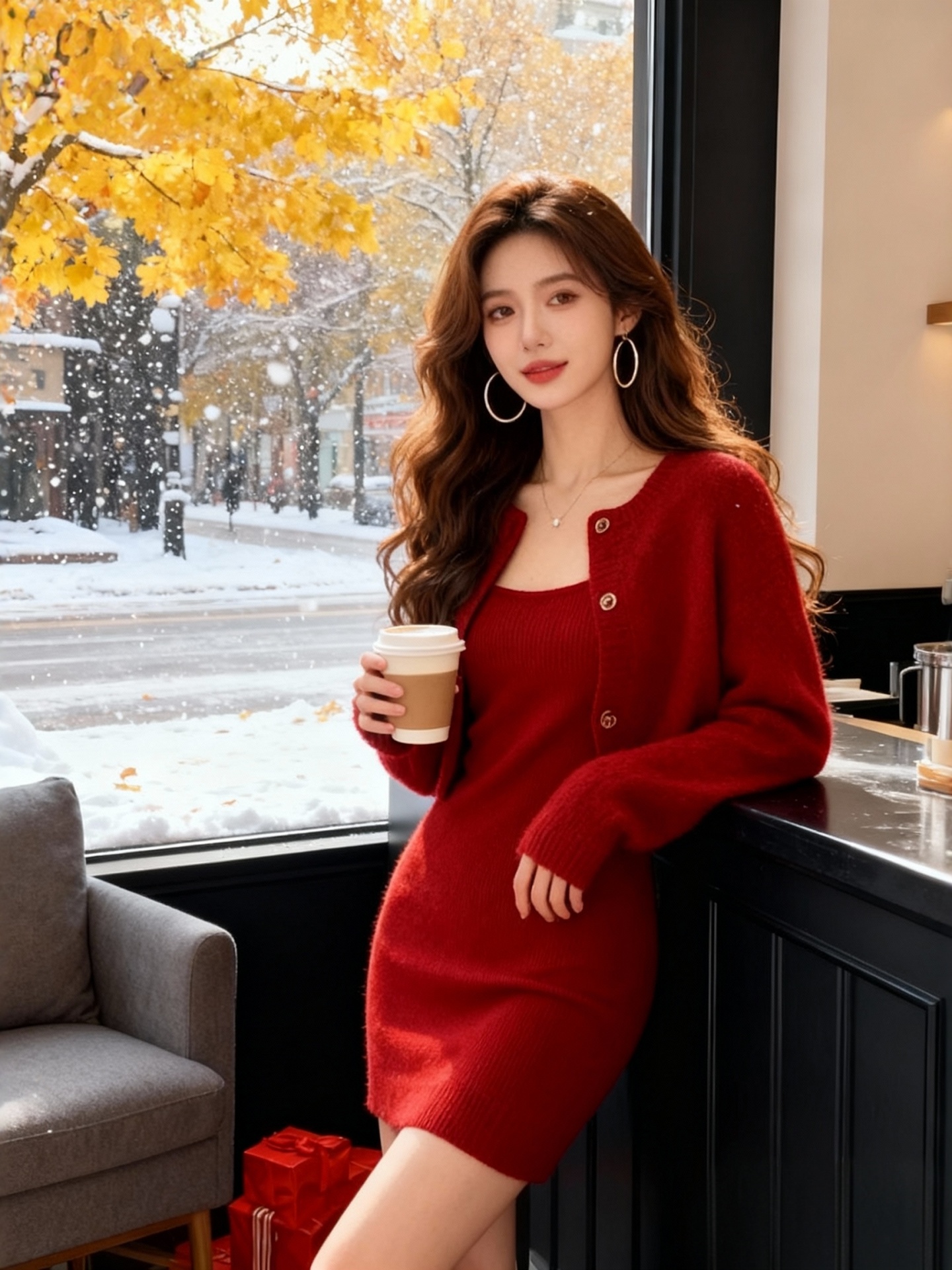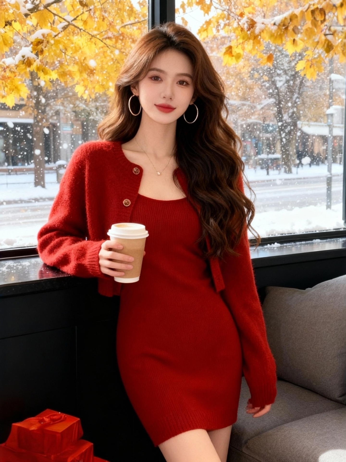 FA50286# 韩国加厚仿貂绒针织毛衣千金风套装圣诞敬酒红色洋气连衣裙两件套 服裝批發女裝批發服飾貨源