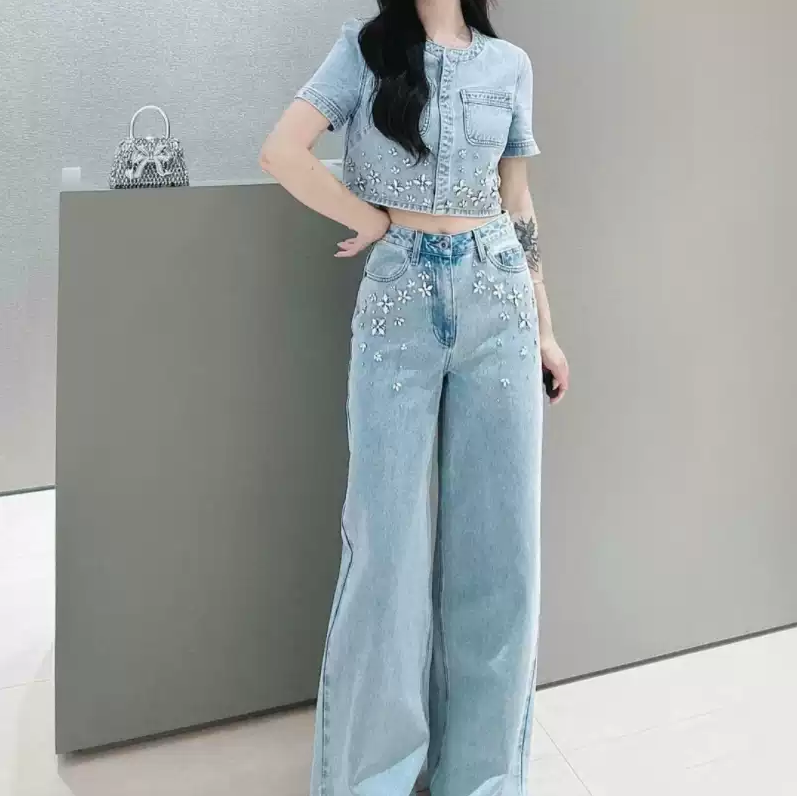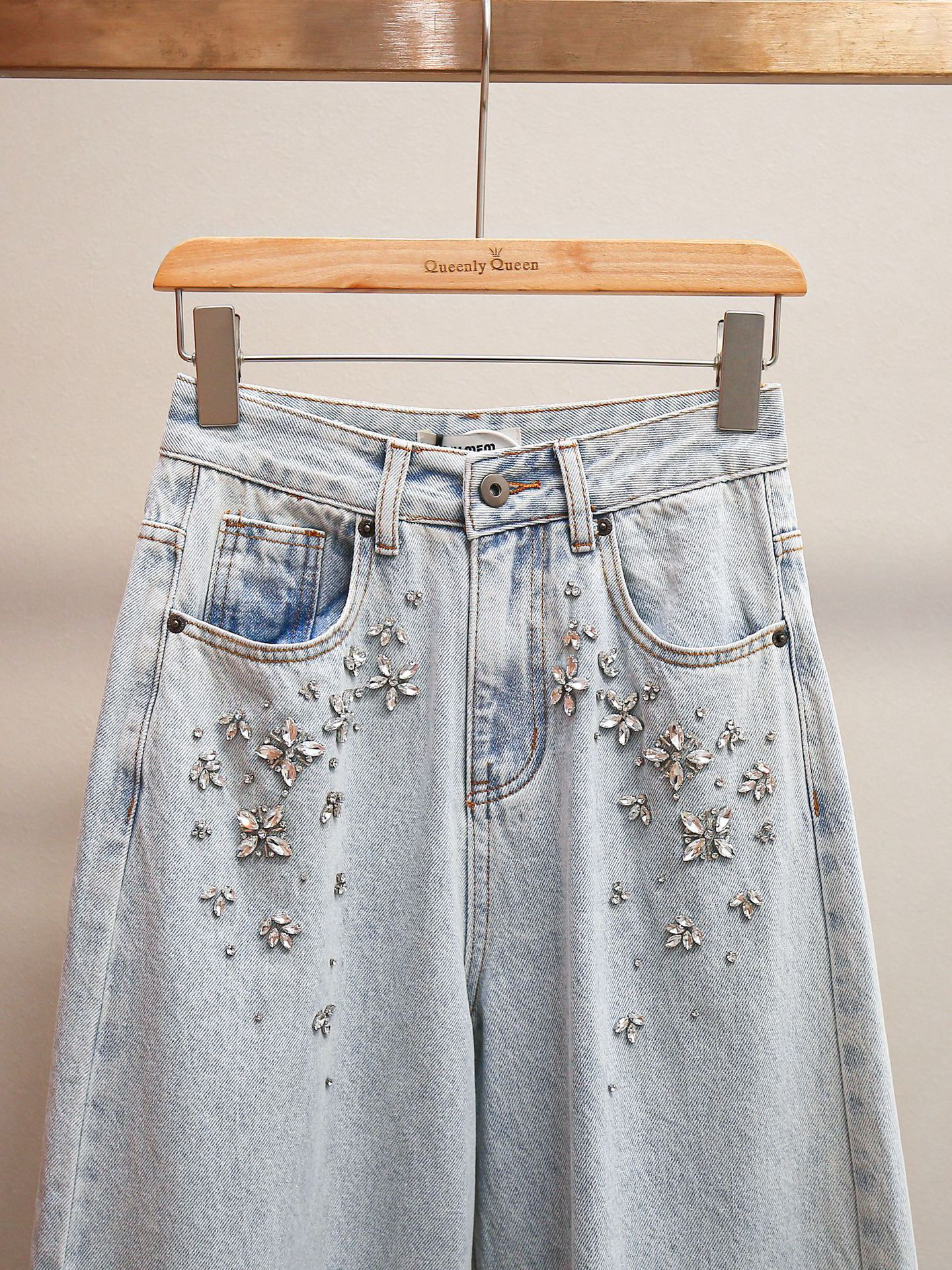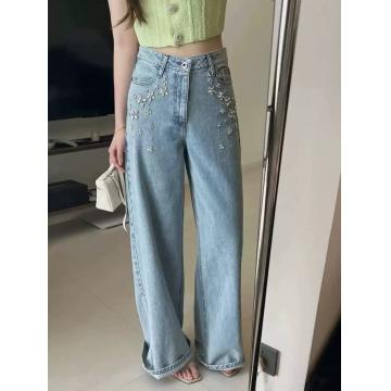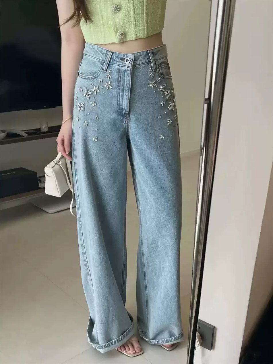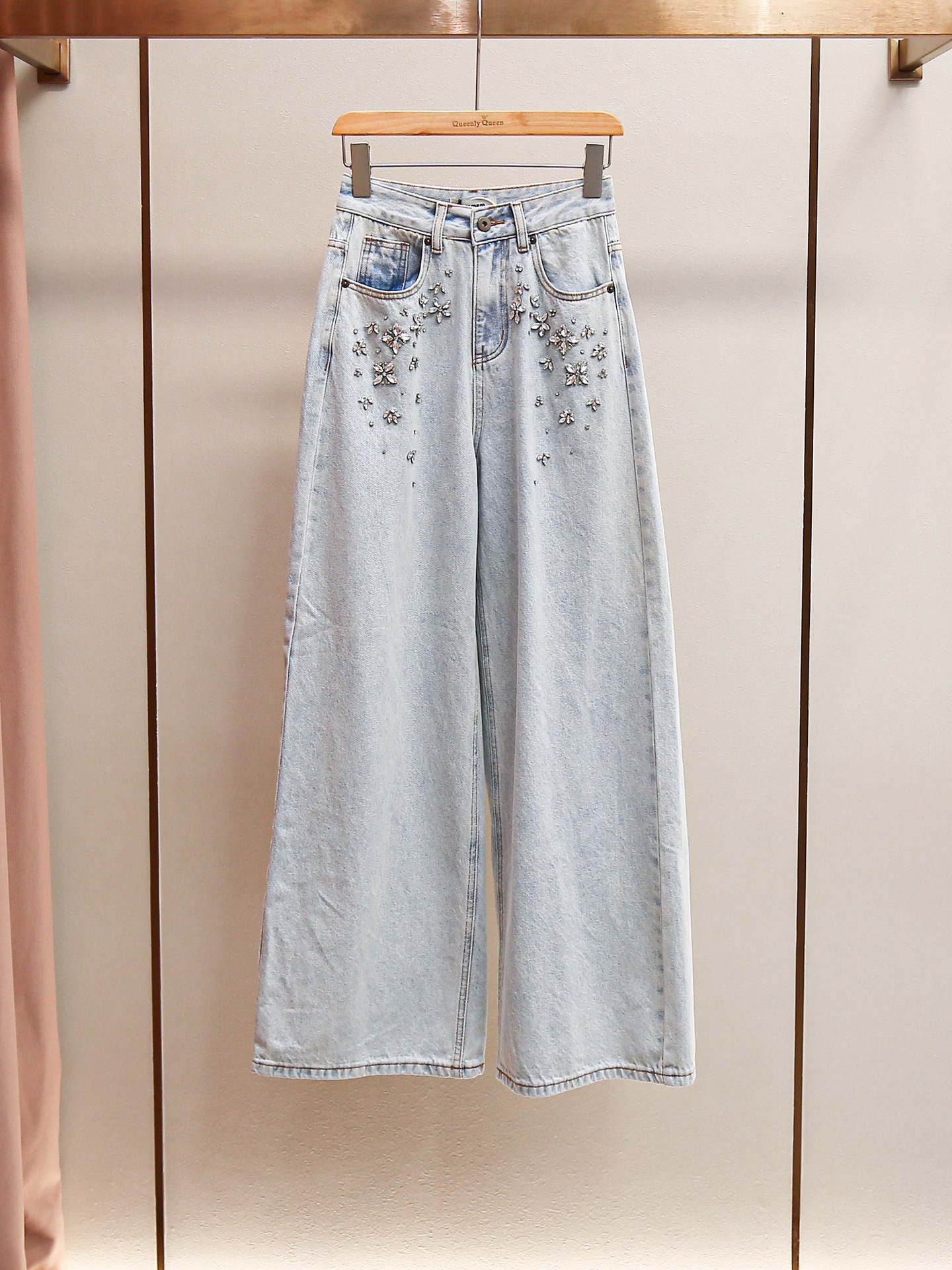 Home > 牛仔裤、长裤 > FA50321# 春秋时尚设计感水钻浅蓝色牛仔阔腿裤复古高腰直筒长裤女 服裝批發女裝批發服飾貨源