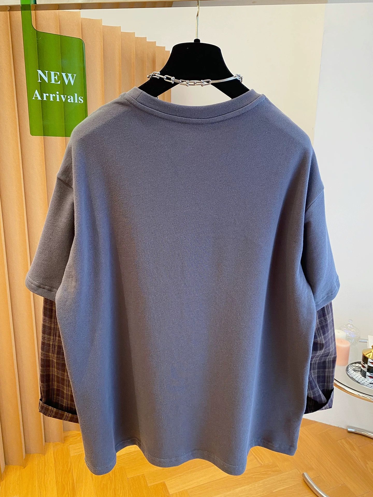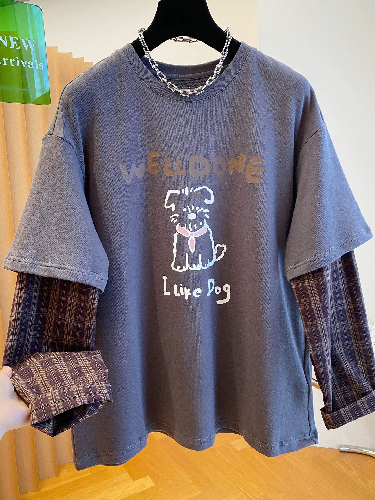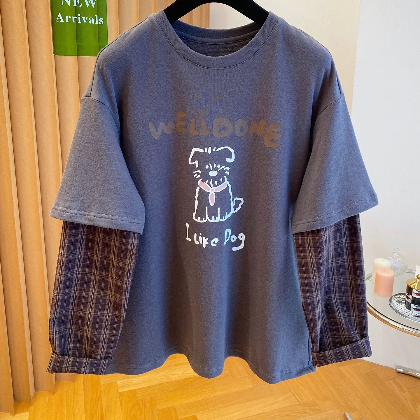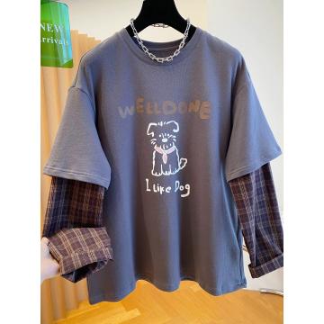 FA50350# 原版质量特大码300斤韩系格子拼接假两件长袖t恤女春秋休闲上衣超 服裝批發女裝批發服飾貨源