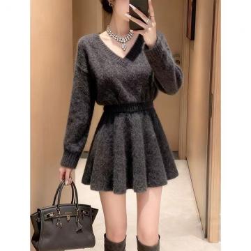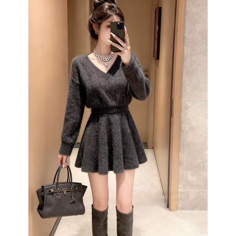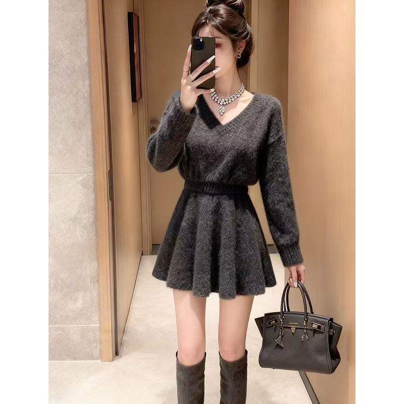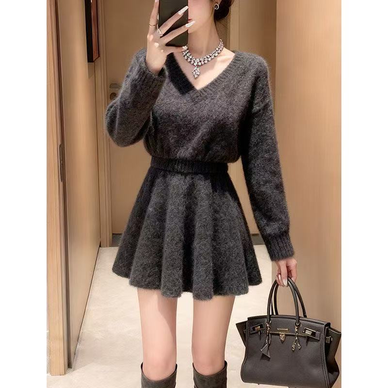 FA50388# 秋冬慵懒长袖毛衣+A字半裙两件套女新款独特别致V领针织灰色套装 服裝批發女裝批發服飾貨源