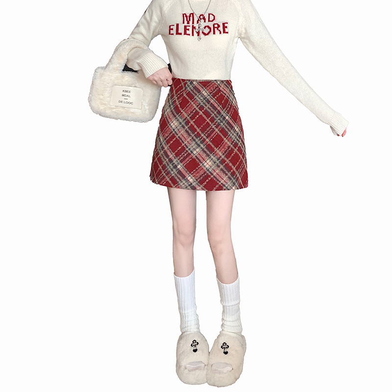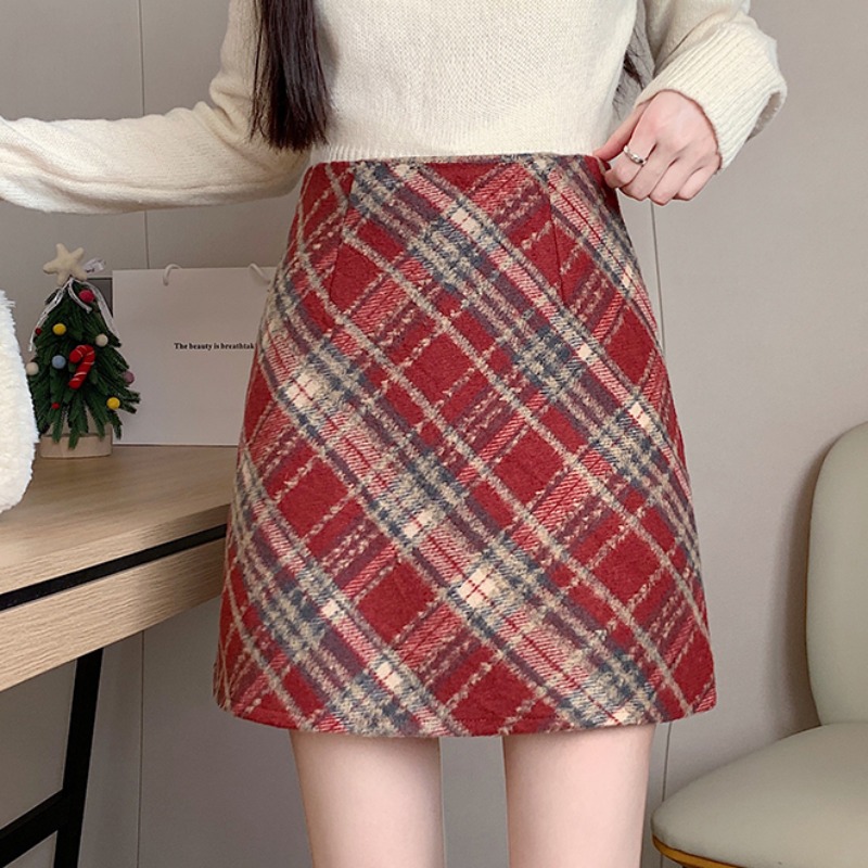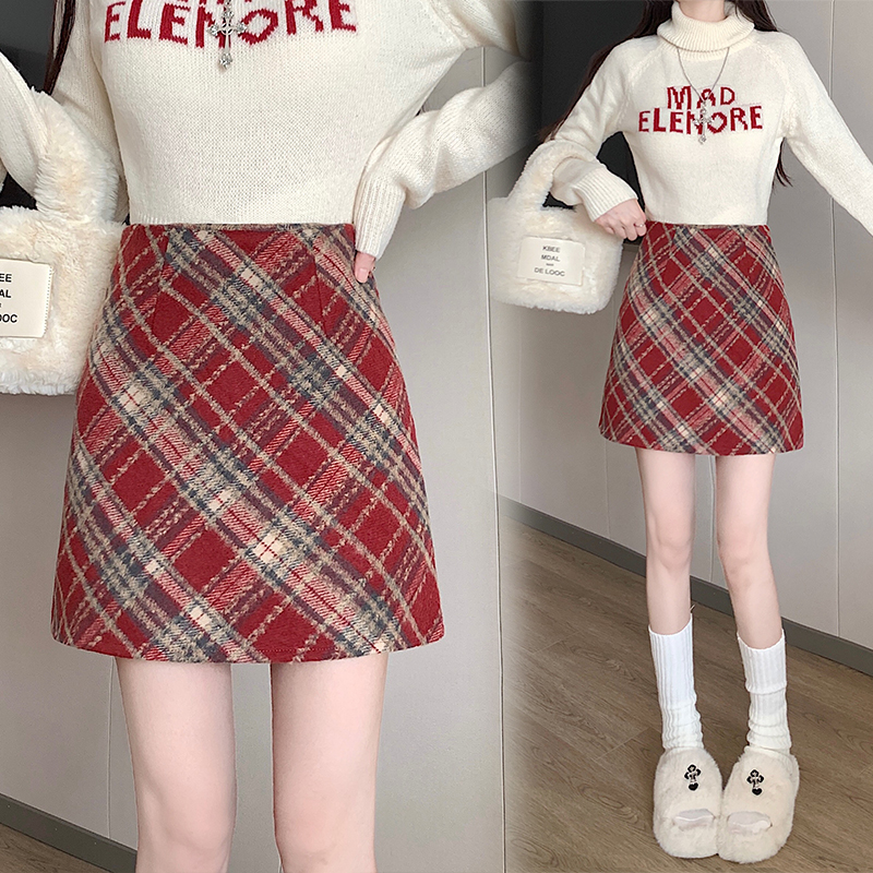 FA50415# 秋冬韩版毛呢复古高腰chic保暖斜格包臀A字半身裙 服裝批發女裝批發服飾貨源