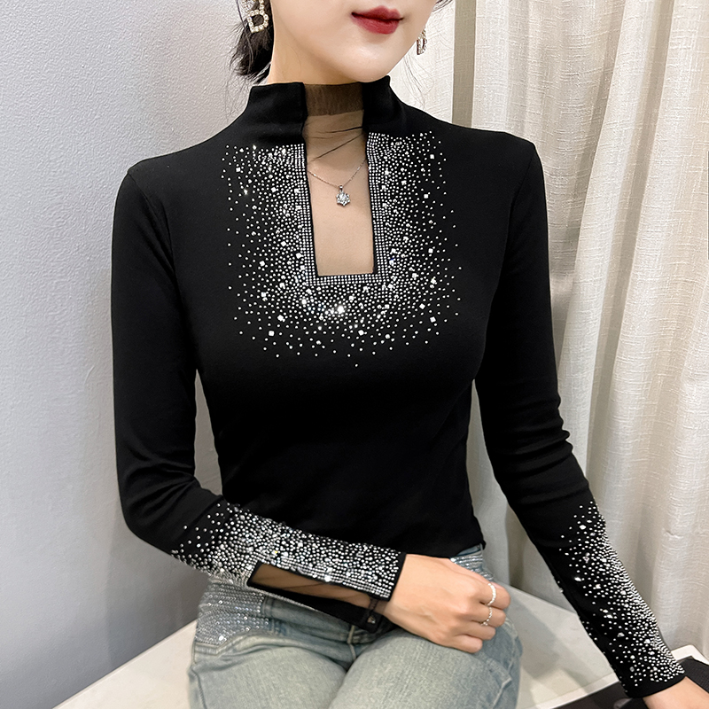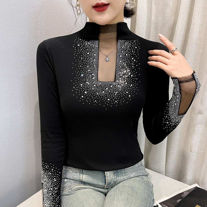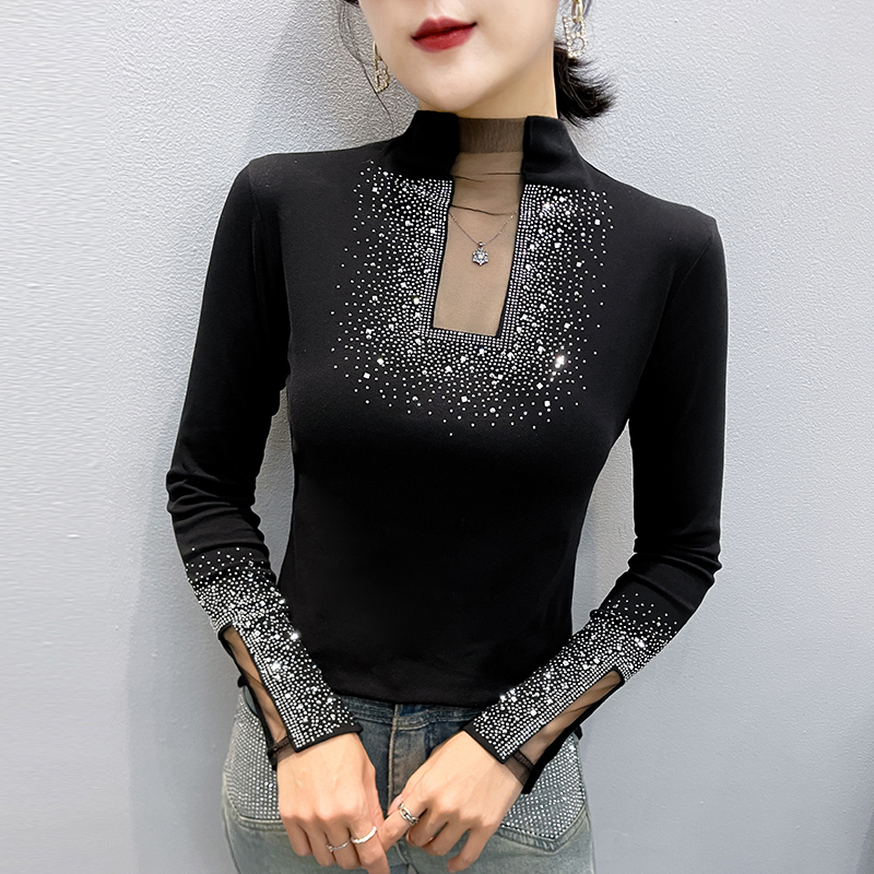 FA50421# 秋冬季新款镂空洋气重工艺烫钻上衣女长袖百搭打底衫潮款 服裝批發女裝批發服飾貨源