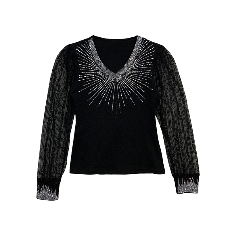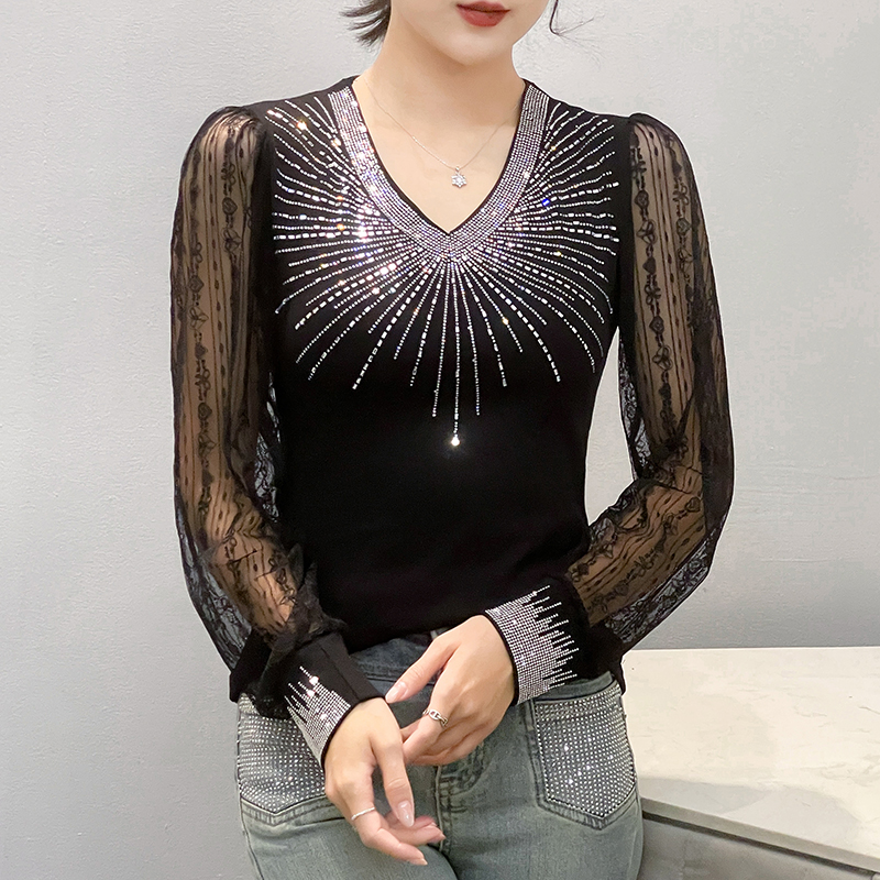 FA50422# 新款重工艺烫钻上衣搭配蕾丝镂空女长袖百搭打底衫潮 服裝批發女裝批發服飾貨源