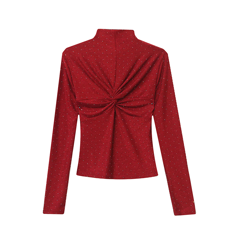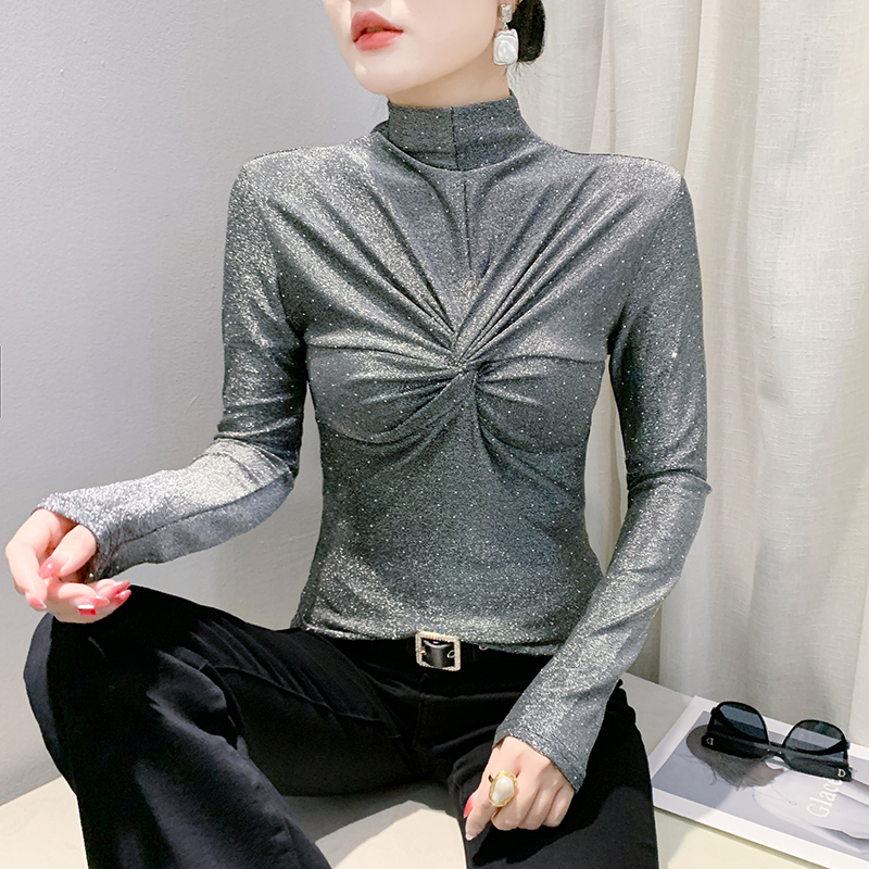 FA50423# 秋冬新款名媛风半高领长袖褶皱时尚镶钻韩丝t恤女修身打底衫 服裝批發女裝批發服飾貨源