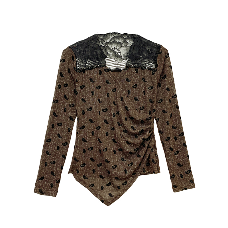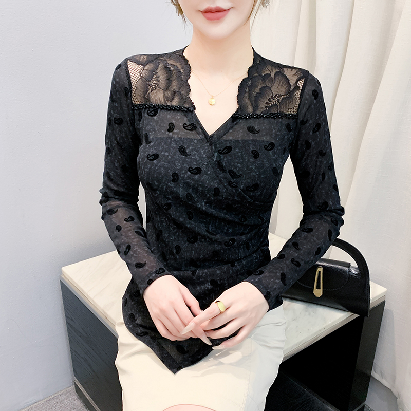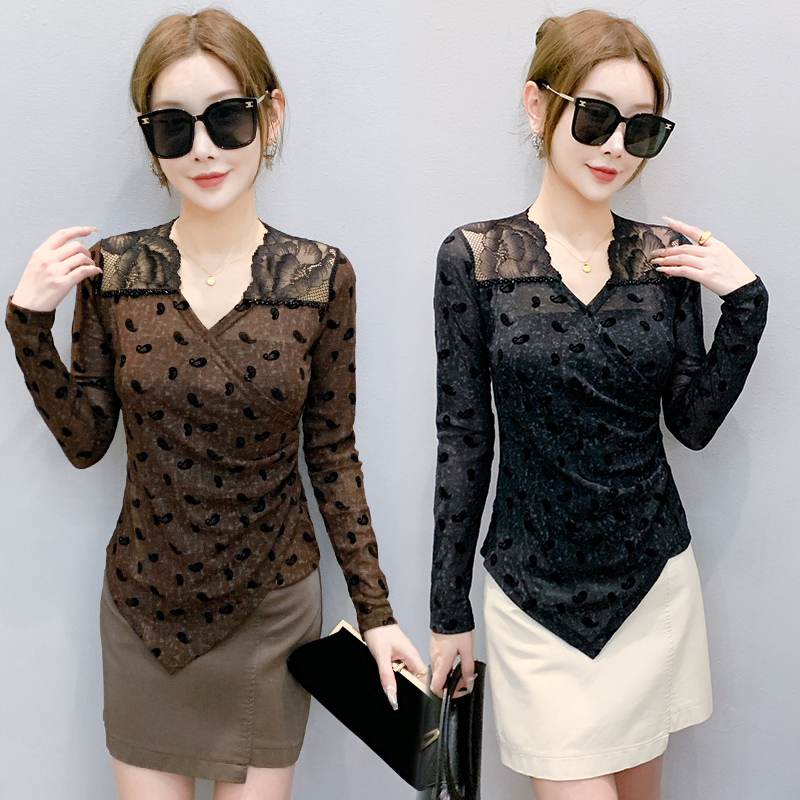 FA50427# 新款V领蕾丝镂空订珠长袖网纱扎染植绒不规则t恤女时尚修身打底衫 服裝批發女裝批發服飾貨源