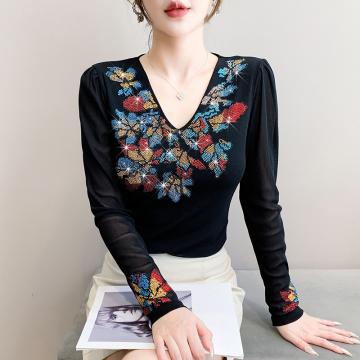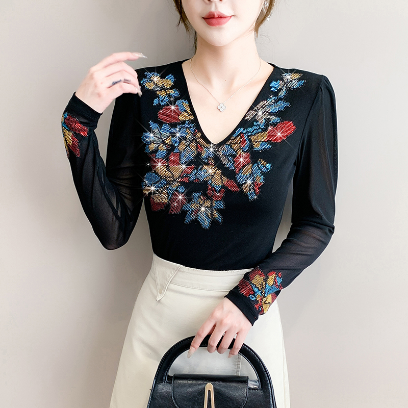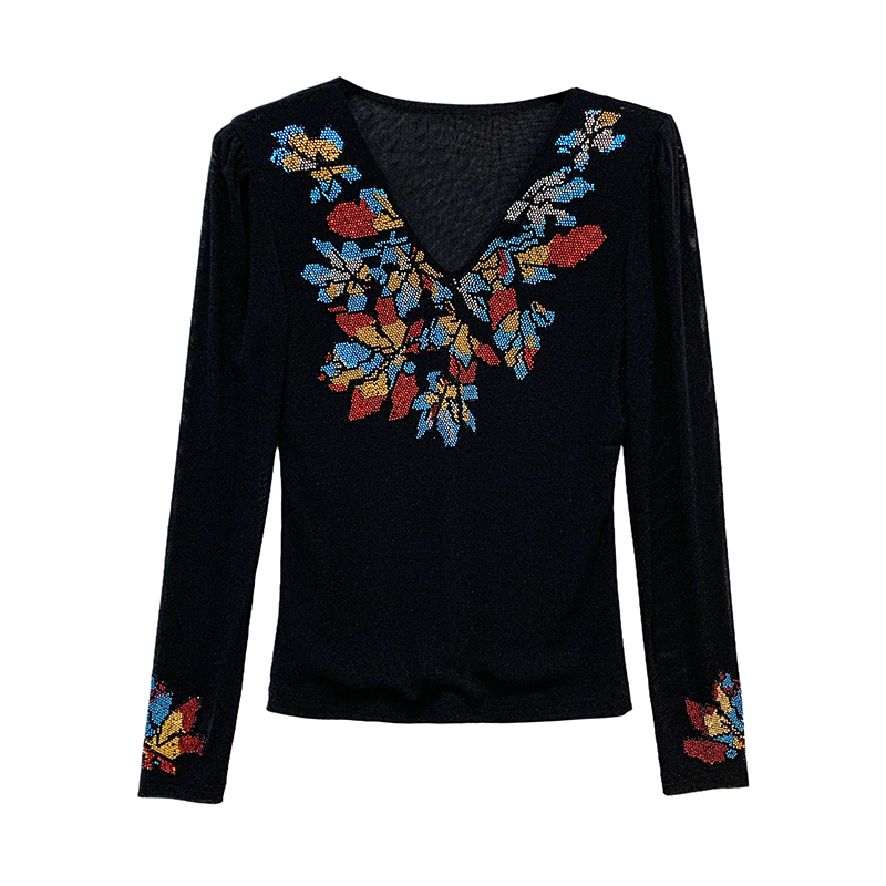 FA50428# 秋季新款性感V领重工艺镶彩色钻上衣修身显瘦百搭长袖打底衫 服裝批發女裝批發服飾貨源