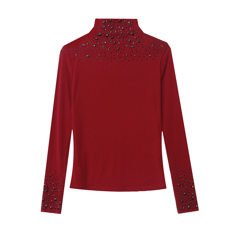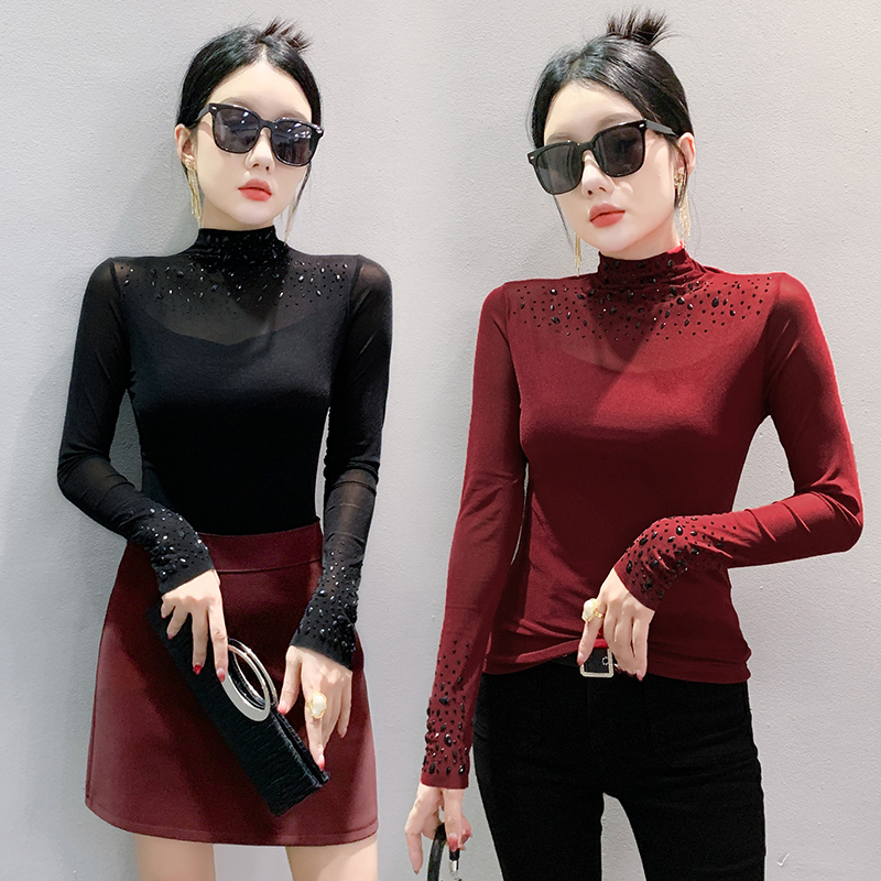 FA50431# 秋季新款高领透视重工艺烫钻修身洋气网纱长袖打底衫上衣女 服裝批發女裝批發服飾貨源