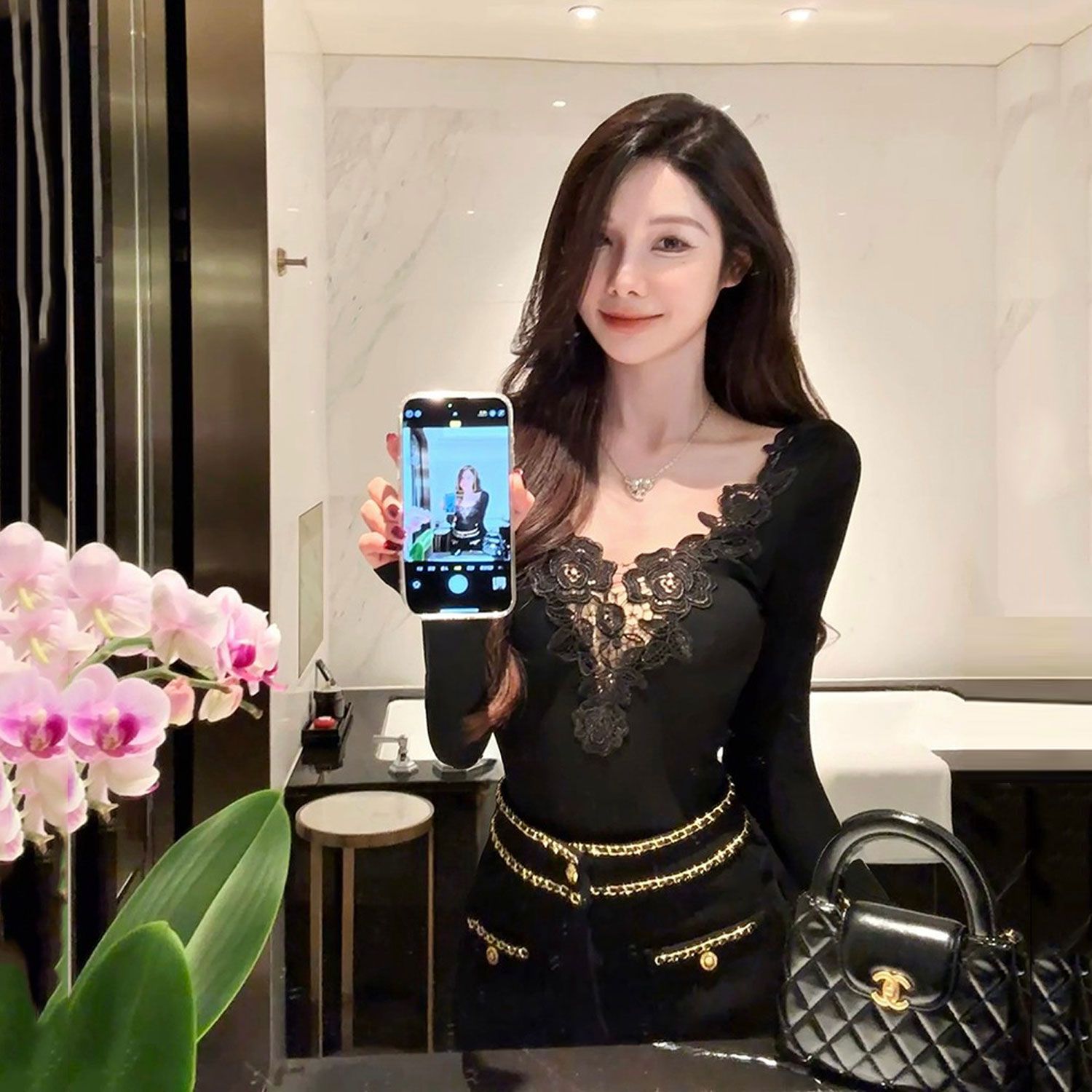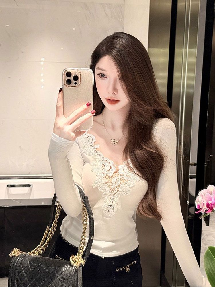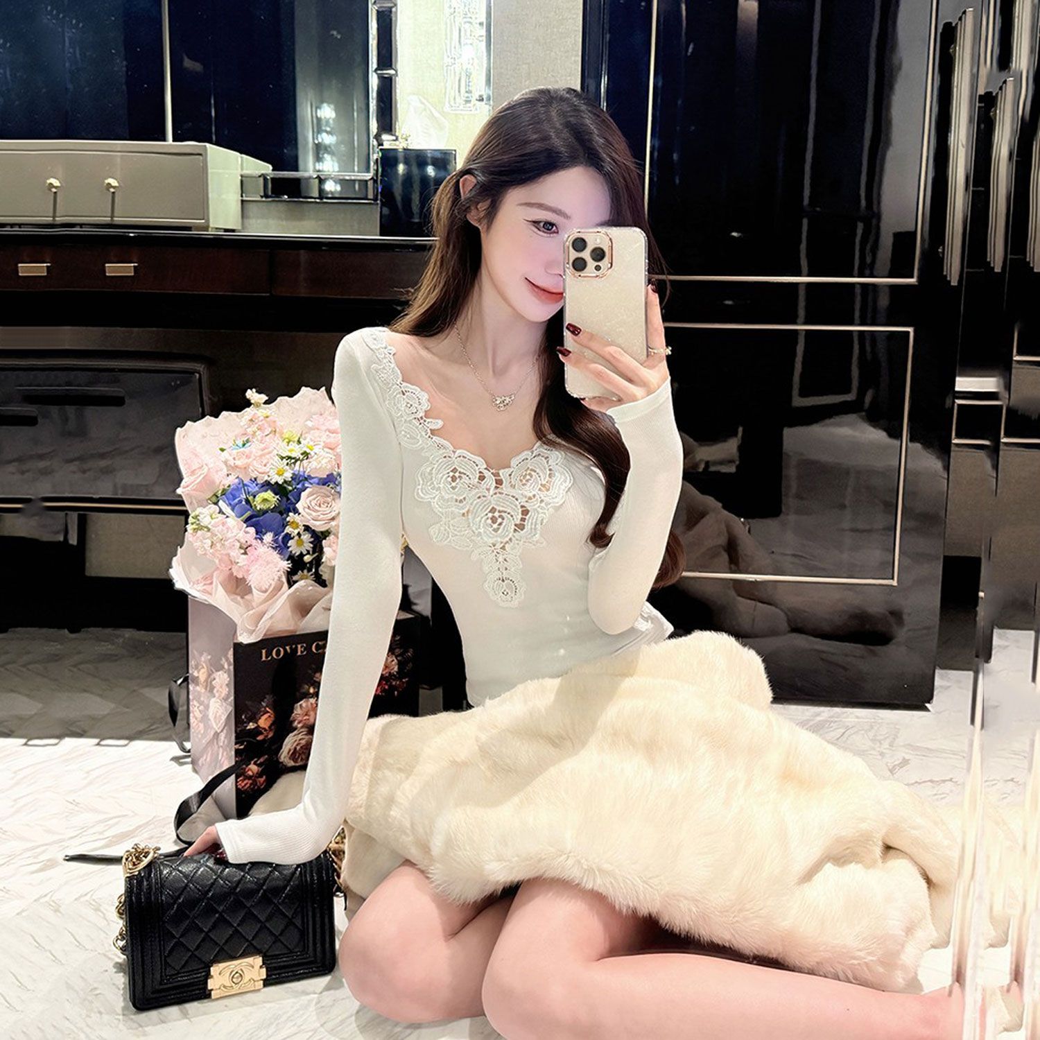 FA50454# 人棉磨毛纯欲性感辣妹蕾丝花边v领针织衫上衣女显瘦内搭打底毛衣 服裝批發女裝批發服飾貨源