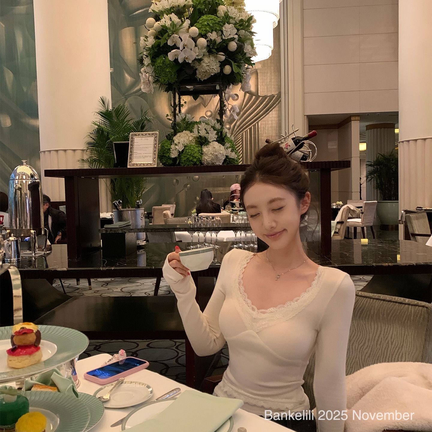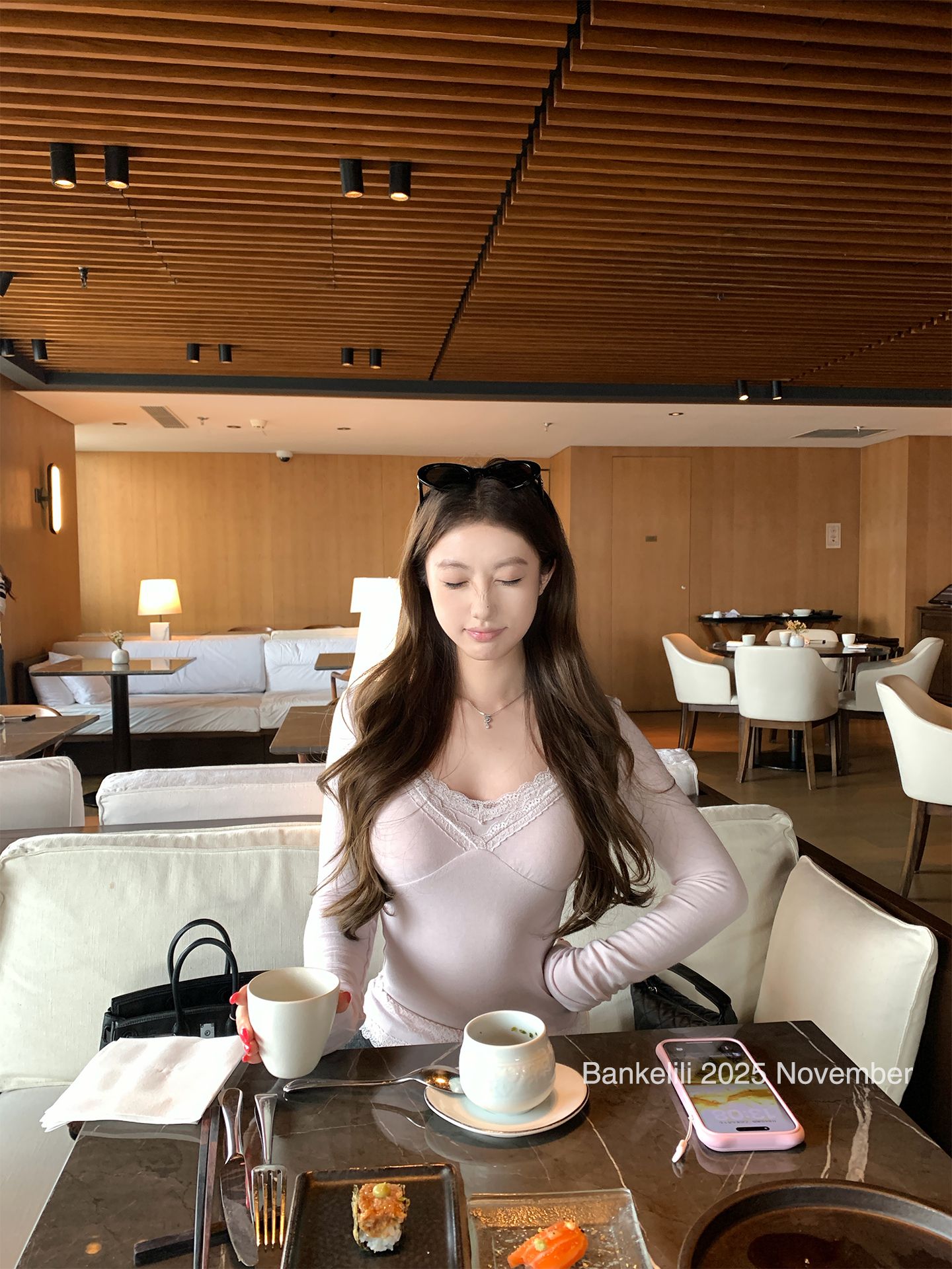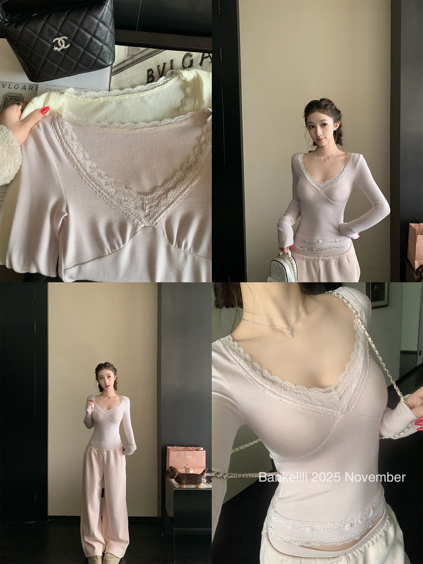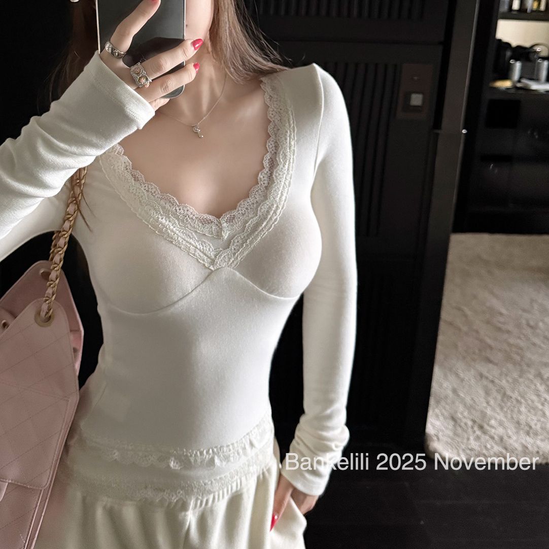 FA50455# 人棉磨毛'奶乖打底'蕾丝花边针织打底衫女秋冬修身上衣 服裝批發女裝批發服飾貨源