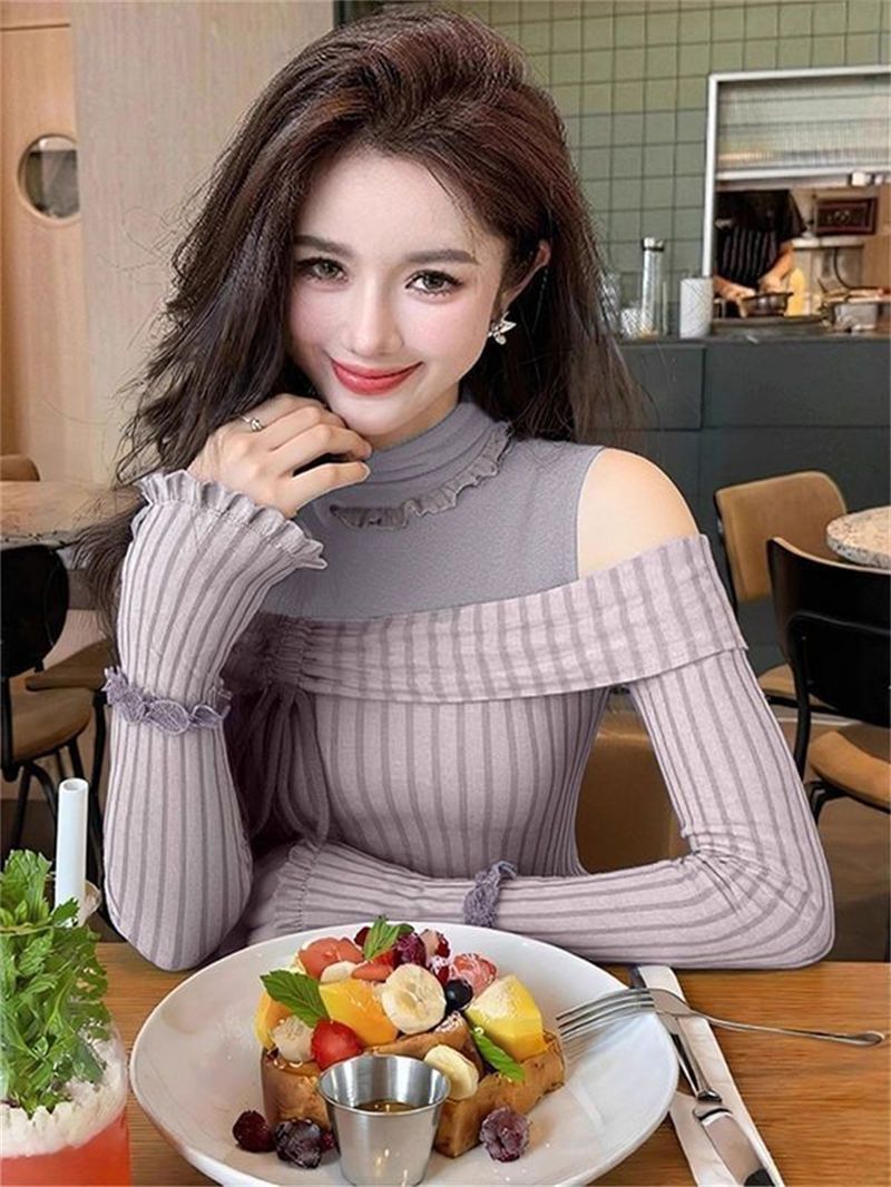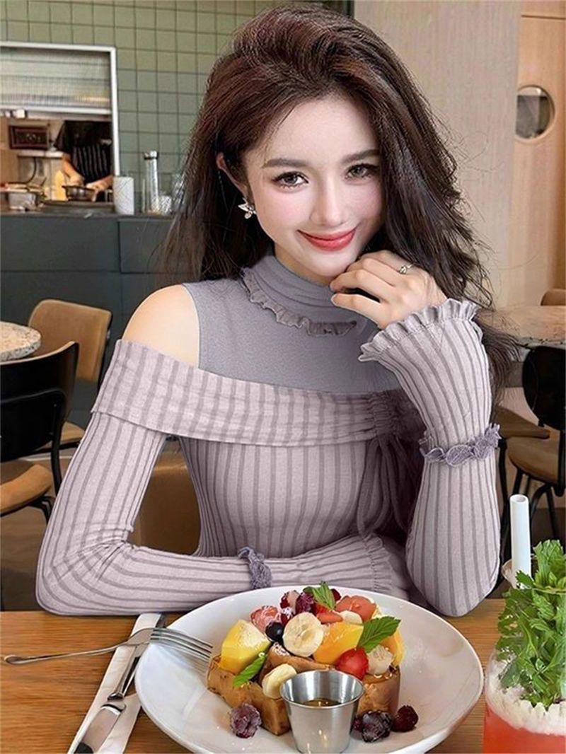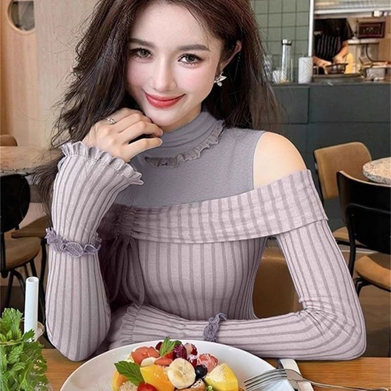 FA50459# 人棉磨毛坑条秋冬独特撞色长袖打底衫女上衣 服裝批發女裝批發服飾貨源